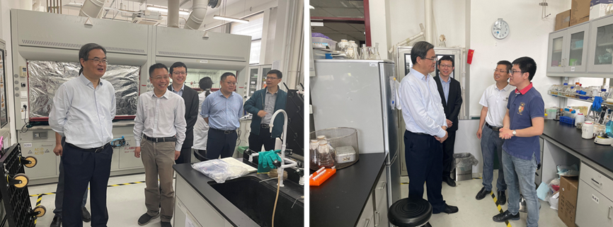 张军校长一行首先走访了医药分子科学与制剂工程工信部重点实验室,重点实验室主任吴彪教授介绍了实验室的研究方向及目前的运行状况。张军校长边听边与大家交流,指出一定要解放思想,年轻人要尽快成长,瞄准药学领域的国家重大需求开展研究,多牵头国家大项目。