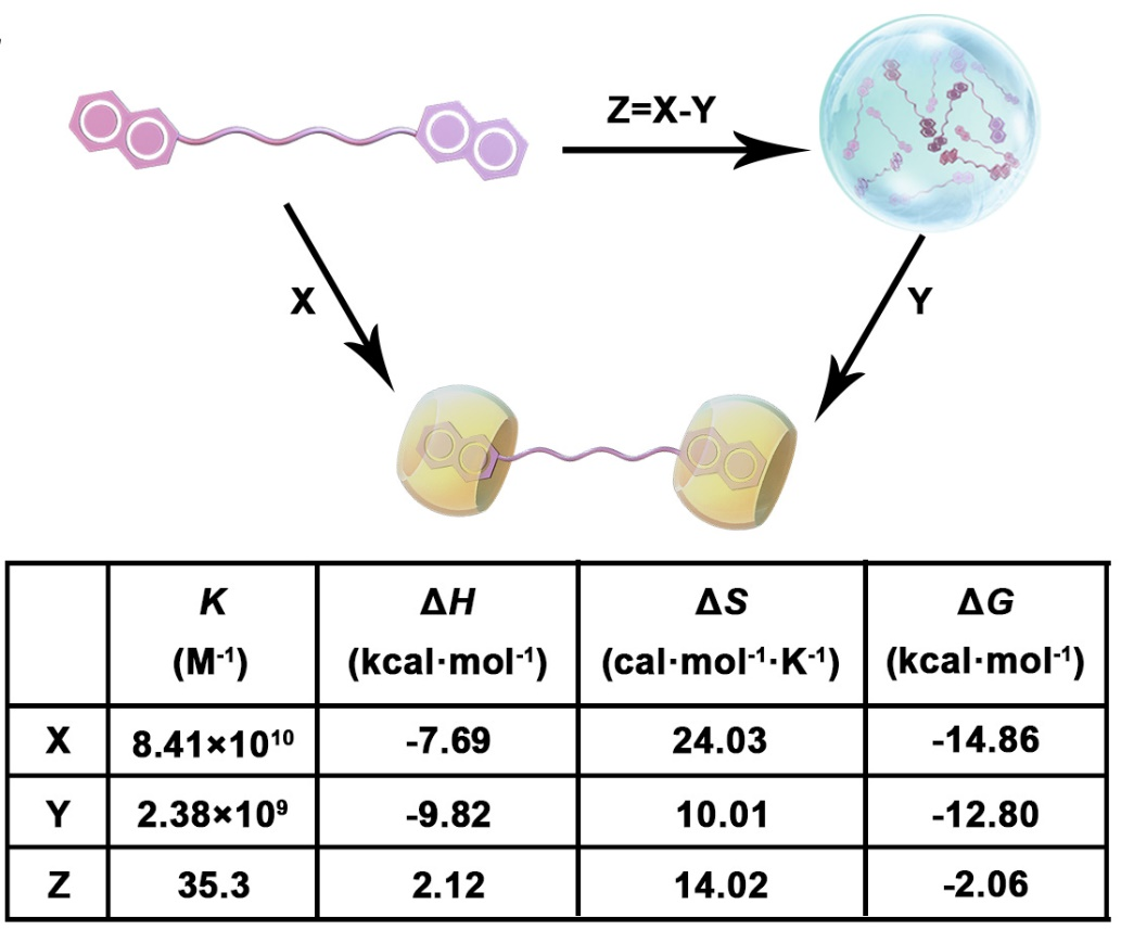 Nap-o-Nap液-液相分离的超分子可逆调控为定量分析相分离过程中的分子驱动力开辟了一条独特的途径。如下图所示,通过设计超分子调控的液-液相分离环路,实现了液-液相分离过程物理化学参数的定量测量(ΔS = 14.0 cal∙mol-1∙K-1, ΔH = 2.1 kcal∙mol-1)。结果表明,液-液相分离是一个熵驱动过程,与常见的表面活性剂组装、油水分相的物理化学过程一致。