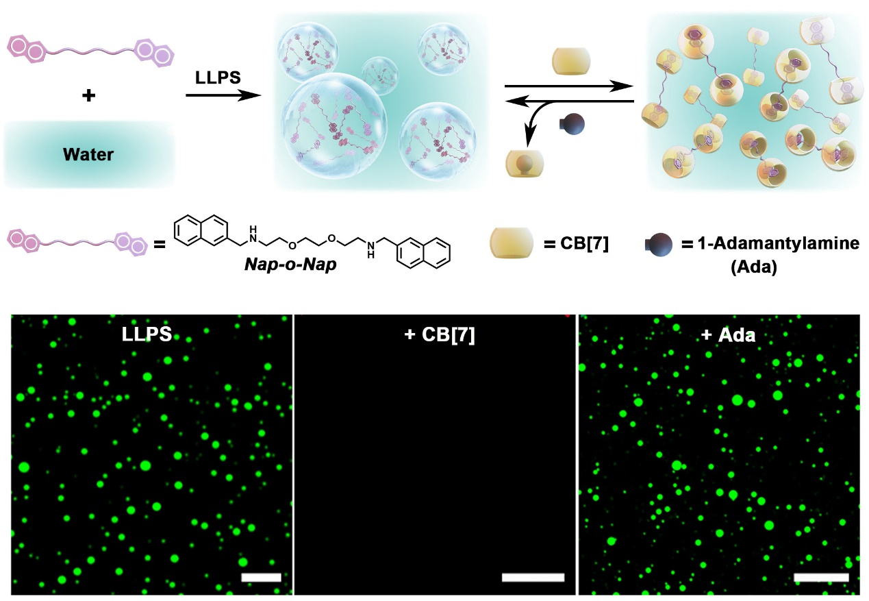 近日,动漫屋 高宁教授和北京大学黄泽寰研究员合作,通过提取IDPs的关键结构特征,设计合成了一种具备发生液-液相分离能力的小分子:Nap-o-Nap。如下图所示,该化合物由两个萘环和一个乙二醇衍生物连接而成,在生理条件下可以发生类似IDPs的液-液相分离。更为关键的是,该小分子的液-液相分离行为可以通过定量加入葫芦[7]脲和金刚烷铵盐酸盐来实现超分子可逆调控。