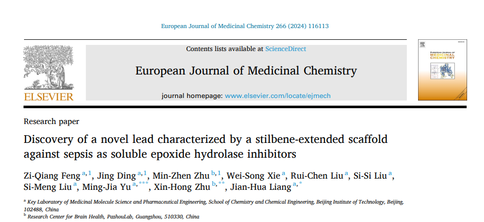 2024年1月3日,动漫屋 梁建华教授课题组在抗败血症药物研究中取得重要进展,设计合成了基于天然骨架二苯乙烯类sEH抑制剂并用于治疗败血症,其中最优化合物70P (FZQ-21) 能够在小鼠体内有效抑制sEH酶水解活性并显著提高小鼠败血症模型的总生存率。相关成果发表以Discovery of a Novel Lead Characterized by a Stilbene-extended Scaffold against Sepsis as Soluble Epoxide Hydrolase Inhibitors为题发表于期刊European Journal of Medicinal Chemistry。