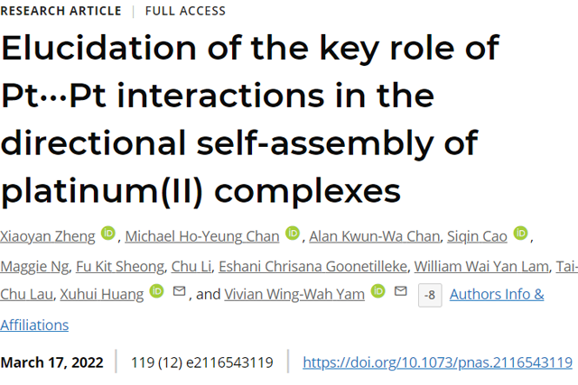 相关研究成果以“Elucidation of the key role of Pt…Pt interactions in the directional self-assembly of platinum(II) complexes”为题,2022年3月发表在国际顶级期刊《Proceeding of the National Academy of Sciences, PNAS》上 (2022, 119 (12) e2116543119). 动漫屋 李泽生教授团队的郑小燕副研究员为该论文的第一作者,香港科技大学黄旭辉教授和香港大学任咏华院士为通讯作者,动漫屋 为第一通讯单位。该研究工作得到了国家自然科学基金面上项目(22173006)和北京市自然科学基金面上项目(2222027)的资助。该文章于2021年9月投稿,黄旭辉课题组当前地址为威斯康星大学。