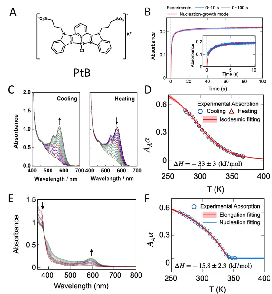 动漫屋 李泽生教授团队的郑小燕副研究员、香港科技大学的黄旭辉教授和香港大学的任咏华院士合作对不同溶剂环境下两亲性Pt(II)配合物PtB的分子组装机制进行了系统的研究。由于分子间Pt···Pt相互作用会产生新的光谱信号,通过变温紫外可见光谱可获取平衡态PtB的组装体相对于单体的比例(α)随温度的变化,作者分别通过等键模型(Isodesmic model)和成核增长模型(Nucleation-Elongation model)拟合不同溶剂下PtB的α-T曲线来探索其分子组装体生长机制。研究发现:在纯水溶液中,α-T曲线符合等键增长模型,所得平衡常数分别为Ke300K = 2.4×103 M-1和Ke368K = 2.6×102 M-1;在丙酮和水混合溶液中,α-T曲线符合成核增长模型,所得平衡常数为Ke298K = 2.6×103 M-1和Ke328K = 1.4×102 M-1。同时成核过程对应的平衡常数为5.0×10-6。此外,作者通过Stopped-flow吸收光谱实验测定了PtB在丙酮和水混合溶液中的组装过程动力学。结果发现,实验数据符合成核增长模型:在t=0.1s时,PtB具有1.1×10-6 M s-1的成核速率,随后成核速率急剧下降直至1.0 s时几乎可忽略不计。在t=0.1s时,PtB的生长速率为10.6 s-1,随着PtB单体被消耗和分子组装体间的融合,其生长速率逐渐降低。这一结果表明PtB在丙酮和水混合物溶液中的组装过程符合成核增长形成机制。