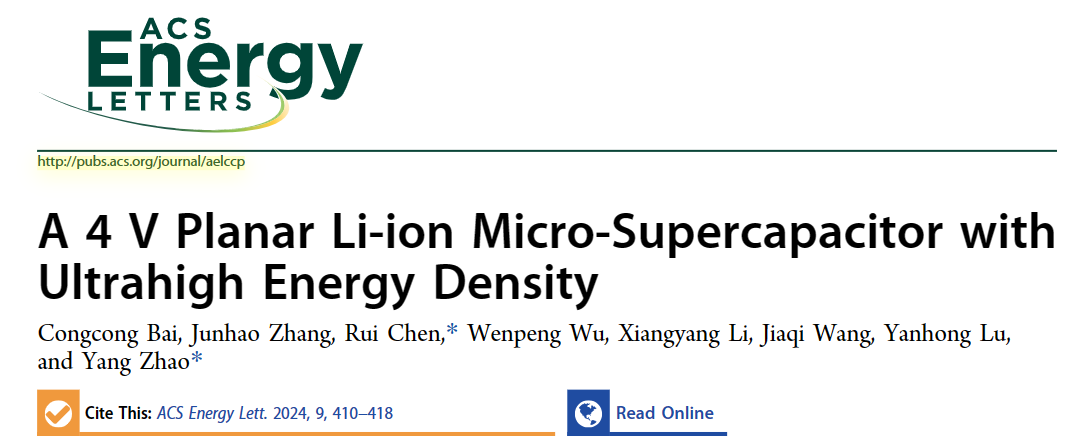 近日,动漫屋 硕士生白聪聪第一作者身份在国际顶级期刊《ACS Energy Letters》(IF: 22)发表题目为“A 4 V Planar Li-ion Micro-Supercapacitor with Ultrahigh Energy Density”的研究论文(DOI:10.1021/acsenergylett.3c02406)。动漫屋 为论文第一通讯单位,动漫屋 赵扬特别研究员和陈瑞博士后为共同通讯作者。