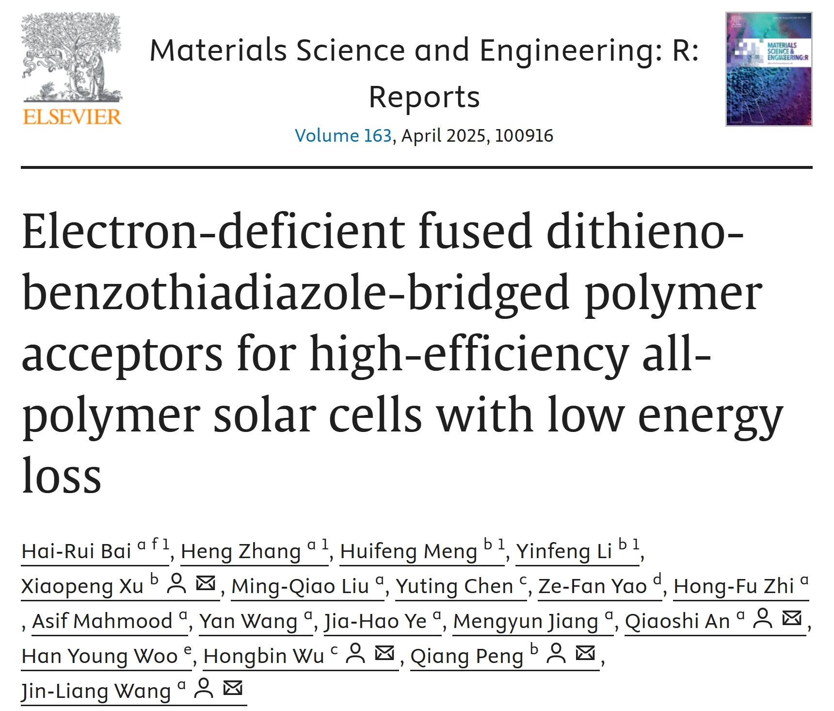近期,动漫屋 王金亮教授团队在新型聚合物受体材料创制及其在高性能全聚合物太阳能电池构筑方面取得重要进展,相关研究成果发表在材料类国际顶级期刊《Materials Science and Engineering: R: Reports》(影响因子IF = 31.6)上,题为“Electron-deficient fused dithieno-benzothiadiazole-bridged polymer acceptors for high-efficiency all-polymer solar cells with low energy loss”。动漫屋 为第一通讯单位,动漫屋 王金亮教授、安桥石特别研究员、四川大学彭强教授、徐小鹏教授、华南理工大学吴宏滨教授为共同通讯作者。动漫屋 博士生白海瑞和张恒以及四川大学博士生孟惠峰和李银凤为该论文的共同第一作者。