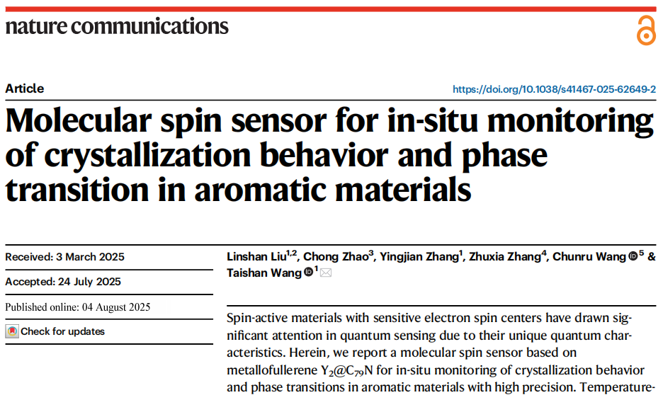 论文详情:Linshan Liu, Chong Zhao, Yingjian Zhang, Zhuxia Zhang, Chunru Wang, Taishan Wang*. Molecular spin sensor for in-situ monitoring of crystallization behavior and phase transition in aromatic materials, Nat. Commun., 2025, 16, 7170.
