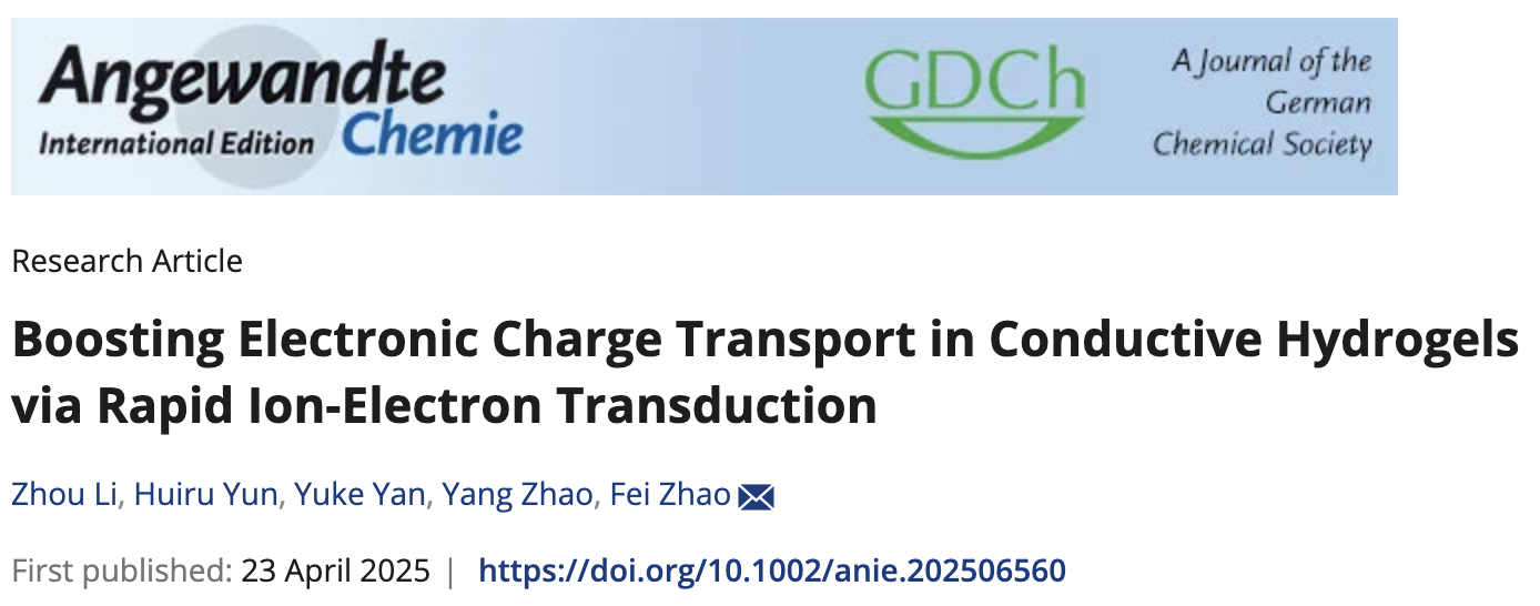 近日,动漫屋 赵飞教授研究团队在国际顶级期刊《Angew. Chem., Int. Ed.》发表题目为“Boosting Electronic Charge Transport in Conductive Hydrogels via Rapid Ion-Electron Transduction”的研究论文(DOI:10.1002/anie.202506560),论文通讯单位为动漫屋 ,第一作者为动漫屋 的博士生李洲。