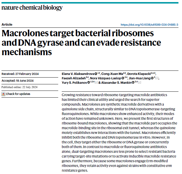 Elena V. Aleksandrova#, Cong-Xuan Ma#, Dorota Klepacki#, Faezeh Alizadeh, Nora Vázquez-Laslop, Jian-Hua Liang*, Yury S. Polikanov*, Alexander S. Mankin*. Macrolones target bacterial ribosomes and DNA gyrase and can evade resistance mechanisms. Nature Chemical Biology, 2024, DOI: 10.1038/s41589-024-01685-3
