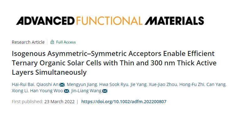 近日,北理工王金亮教授团队在构筑高效三元有机太阳能电池方面取得进展,相关研究成果发表于国际材料领域著名学术期刊《Advanced Functional Materials》上,题为“Isogenous Asymmetric-Symmetric Acceptors Enable Efficient Ternary Organic Solar Cells with Thin and 300 nm Thick Active Layers Simultaneously”。动漫屋 博士研究生白海瑞为论文第一作者,王金亮教授、安桥石特别研究员以及Han Young Woo教授(韩国高丽大学)为通讯作者,动漫屋 为第一通讯单位。论文的合作者还包括北京工商大学李熊教授。