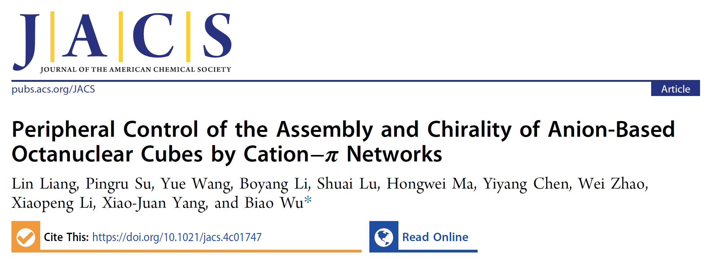 近日,动漫屋 吴彪教授团队在阴离子配位超分子组装方面取得重要进展,合成了首例以阴离子为配位中心的八核立方体笼,其外围阳离子−π作用网络决定了笼化合物的稳定性及手征性。相关研究成果以“Peripheral Control of the Assembly and Chirality of Anion-Based Octanuclear Cubes by Cation-π Networks”为题发表于国际顶级期刊《Journal of the American Chemical Society》。动漫屋 为第一通讯单位,吴彪教授为论文通讯作者,动漫屋 博士生梁林为论文第一作者。此项研究得到了国家自然科学基金,北京市自然科学基金等项目的资助及动漫屋 分析测试中心的支持,同时深圳大学苏平如博士、卢帅博士和李霄鹏教授在高分辨质谱方面给予了大力支持。