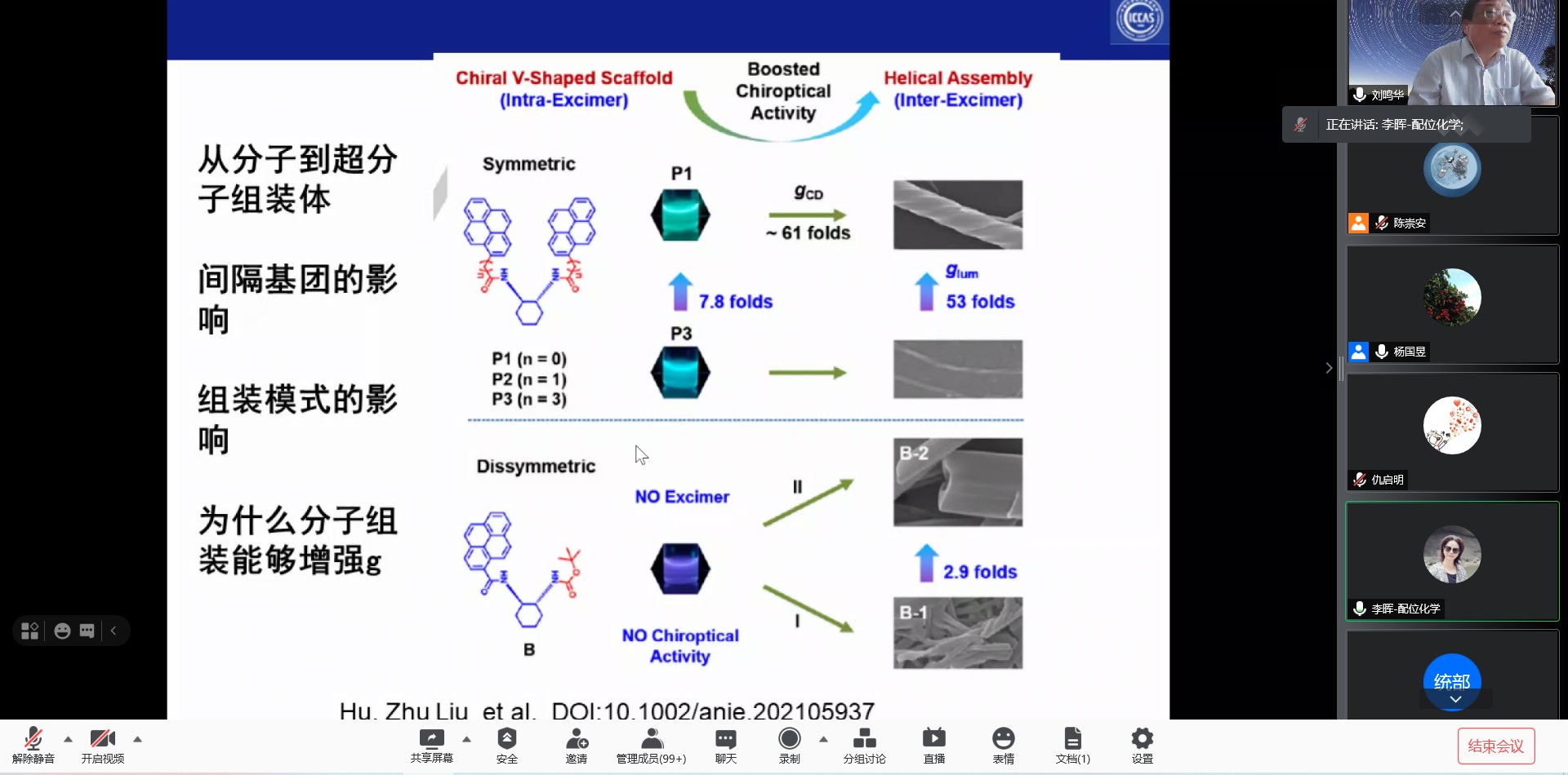 应动漫屋 邀请,中科院化学所刘鸣华教授于2021年7月2日8:40做客北理工“百家大讲堂”,为我院广大师生带来题为“超分子手性自组装与圆偏振发光材料”的精彩学术报告。本次报告在腾讯会议平台线上进行,由杨国昱老师主持,近百名化院师生参加了报告。