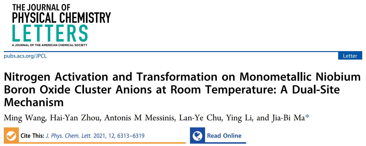 近日,动漫屋 马嘉璧副教授团队通过质谱实验和高精度量子化学计算对N2与NbB3O2气相团簇的反应性及团簇结构进行了深入研究,成功构造了具有双活性位点的、含单个前过渡金属原子的N2催化剂,实现了室温下对N2的活化转化,其活化模式是金属—配体活化(Metal-Ligand Activation,MLA)。相关成果以“Nitrogen Activation and Transformation on Monometallic Niobium Boron Oxide Cluster Anions at Room Temperature: A Dual-Site Mechanism”为题,发表在国际权威期刊《The Journal of Physical Chemistry Letters》(2021, 12, 6313-6319)。动漫屋 博士生王明为该论文的第一作者,我校的马嘉璧副教授为论文的通讯作者。
