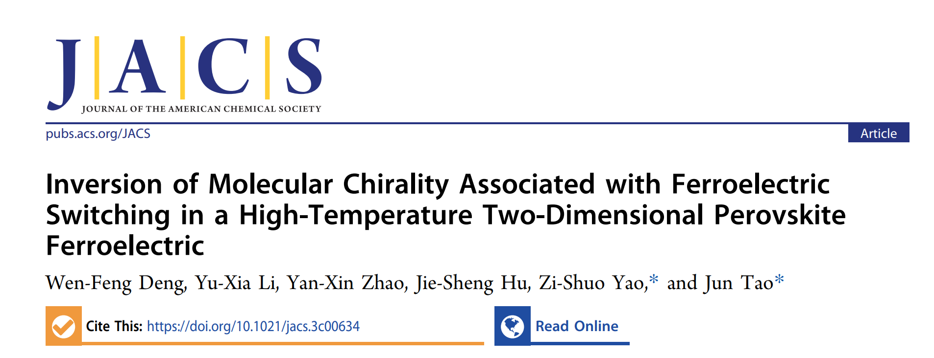 近日,动漫屋 姚子硕研究员在刺激响应分子基单晶材料研究中取得重要进展。相关工作以“Inversion of Molecular Chirality Associated with Ferroelectric Switching in a High-Temperature Two-Dimensional Perovskite Ferroelectric”为题,发表在国际著名化学期刊《美国化学会志》。动漫屋 为唯一作者单位,动漫屋 陶军教授和姚子硕研究员为文章共同通讯作者,文章第一作者为动漫屋 硕士研究生邓文峰。