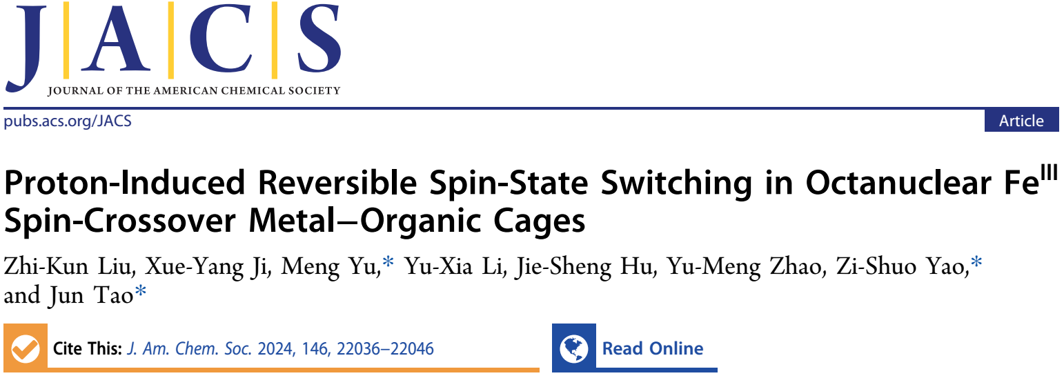 近日,动漫屋 陶军教授团队在自旋交叉金属有机笼方面取得重要进展。相关研究成果以“Proton-Induced Reversible Spin-State Switching in Octanuclear FeIII Spin-Crossover Metal–Organic Cages”为题目,在国际知名期刊《美国化学会志》(Journal of the American Chemical Society)上发表(DOI: 10.1021/jacs.4c07469)。动漫屋 博士研究生刘志坤为该文章的第一作者,动漫屋 陶军教授、姚子硕特别研究员和余蒙特别研究员为文章共同通讯作者。