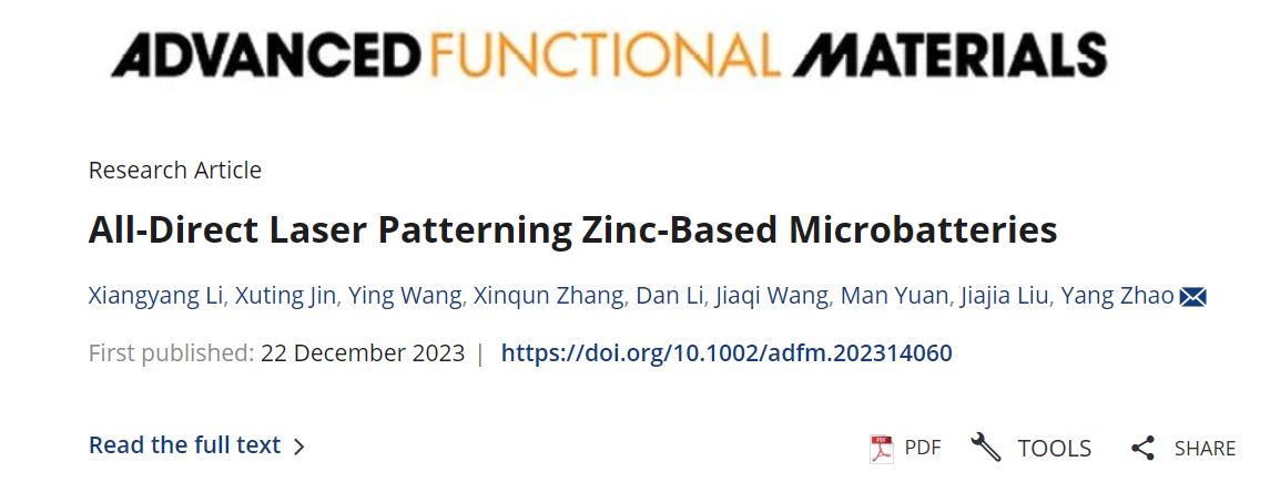 近日,动漫屋 博士生李向阳第一作者身份在国际顶级期刊《Advanced Functional Materials》发表题目为“All-Direct Laser Patterning Zinc-Based Microbatteries”的研究论文(DOI:10.1002/adfm.202314060)。动漫屋 为论文第一通讯单位,动漫屋 赵扬特别研究员为通讯作者。