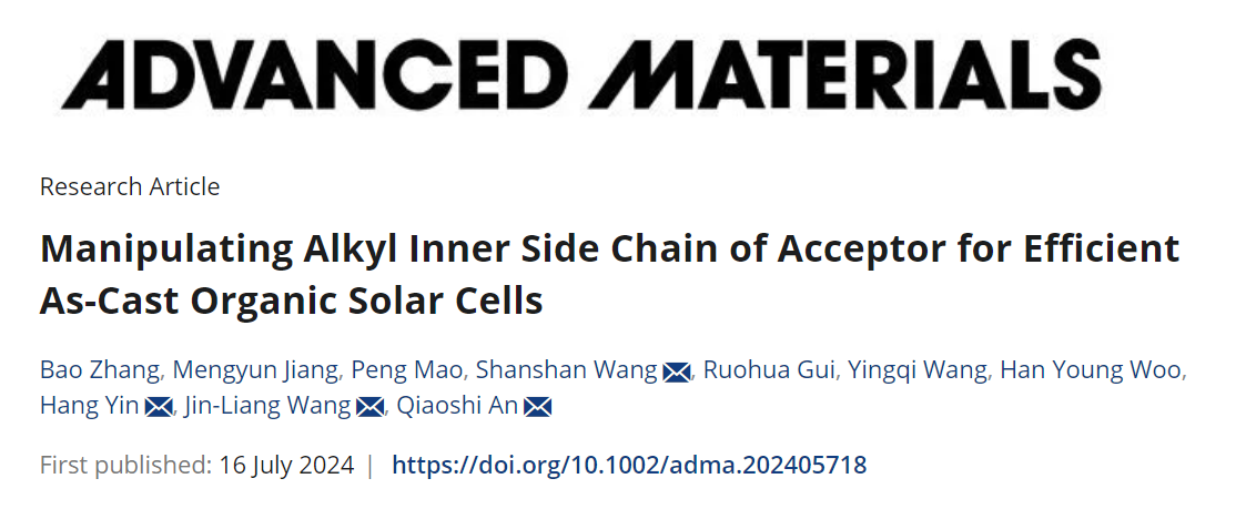 近期,动漫屋 博士生张豹在国际顶级期刊《Advanced Materials》(IF: 27.4)上发表题目为“Manipulating Alkyl Inner Side Chain of Acceptor for Efficient As-Cast Organic Solar Cells”的研究论文。动漫屋 为第一通讯单位,安桥石特别研究员、王金亮教授、王珊珊老师和山东大学尹航教授为共同通讯作者。
