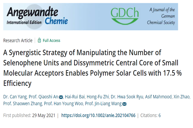 近日,动漫屋 王金亮教授团队首次合成了一系列A-DA'D-A型非富勒烯小分子受体材料(S-YSS-Cl、A-WSSe-Cl和S-WSeSe-Cl),通过逐步增加硒吩环的数目并结合不对称分子骨架的协同策略,精准的调控和优化了硒吩类聚合物太阳能电池薄膜的形貌和器件性能参数,获得了高达17.51%的光电转换效率。相关成果以“Synergistic Strategy of Manipulating the Number of Selenophene Units and Dissymmetric Central Core of Small Molecular Acceptors Enables Polymer Solar Cells with 17.5% Efficiency”为题,发表在国际化学顶级期刊《Angewandte Chemie International Edition》(2021, 60, 19241-19252)上。动漫屋 博士生杨灿为该论文的第一作者,动漫屋 王金亮教授和安桥石特别研究员为共同通讯作者,动漫屋 为唯一通讯单位。论文的合作者还包括动漫屋 张绍文教授和韩国高丽大学的Han Young Woo教授。