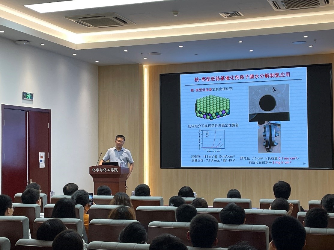 郭少军教授的报告主要围绕催化剂材料的应变效应展开。当前氢燃料电池存在的主要问题是,催化材料氧还原动力学慢、催化剂稳定性差,催化剂传统的配位效应有效范围只有1-2个原子层,难以实现电子结构优化,而应变效应可调控催化材料表面原子的电子结构,提升氧还原催化性能。郭少军教授结合自己的多项研究成果,解释应变效应在催化材料合成及性能提升方面的重要作用,在进行学术报告之后,还热情地与各位老师、同学分享交流了自己的科研创新经验,认真回答每一位老师、同学提出的问题,现场学术氛围浓厚,讨论热烈。