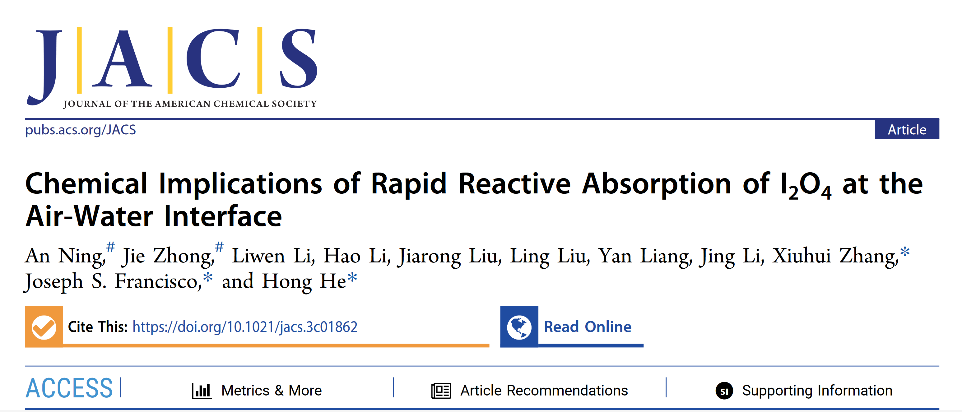 近日,动漫屋 /原子分子簇科学教育部重点实验室张秀辉教授团队与中科院生态环境中心贺泓研究员团队和美国宾夕法尼亚大学Joseph S. Francisco教授团队合作,在海洋气溶胶增长机制研究方面取得重要进展。相关研究成果以“Chemical Implications of Rapid Reactive Absorption of I2O4 at the Air-Water Interface”为题,在国际顶级化学期刊《美国化学会志》(Journal of the American Chemical Society, JACS)上发表(DOI: 10.1021/jacs.3c01862)。该工作以动漫屋 为第一通讯单位,张秀辉教授、贺泓研究员和Joseph S. Francisco教授为共同通讯作者,动漫屋 博士后宁安与中国石油大学钟杰教授为该论文的共同第一作者。