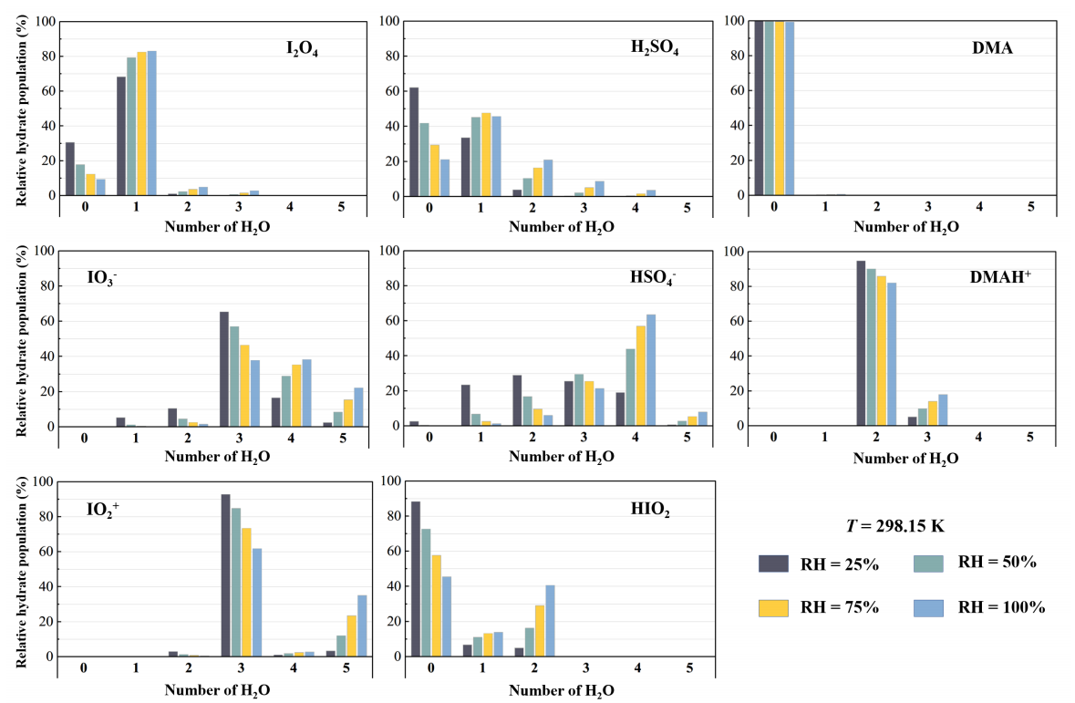 动漫屋 张秀辉教授团队及其合作者通过量子化学计算与第一性原理分子动力学模拟相结合的方案揭示的大气中硫酸和胺类物质影响下的I2O4的气-液界面(即液相气溶胶表面)上的非均相反应机制则较好地解释了上述分歧问题。由于真实大气中的化学组分远比“单纯”的实验环境更为复杂,除碘氧化物外,还存在着污染物硫酸、以及海洋类生物排放生成的胺类组分。她们合作研究发现,在硫酸和有机胺的参与下,I2O4可在气溶胶气-液界面快速(皮秒级别)反应(图1)生成亚碘酸HIO2以及一系列离子产物,如HSO4-、IO3-、DMAH+等。所生成的反应产物间可通过氢键、卤键和离子键结合为尺寸更大的复合物,进而限制其向液滴体相的扩散;同时,界面水分子通过氢键与产物分子结合,使其难以蒸发至气相(图2)。且上述附着于液滴表面的产物(IO3-/DMAH+等)相比于反应物(I2O4/DMA等)有更低的挥发性和更高的吸湿性(图3),还可促进气溶胶的吸湿性增长。