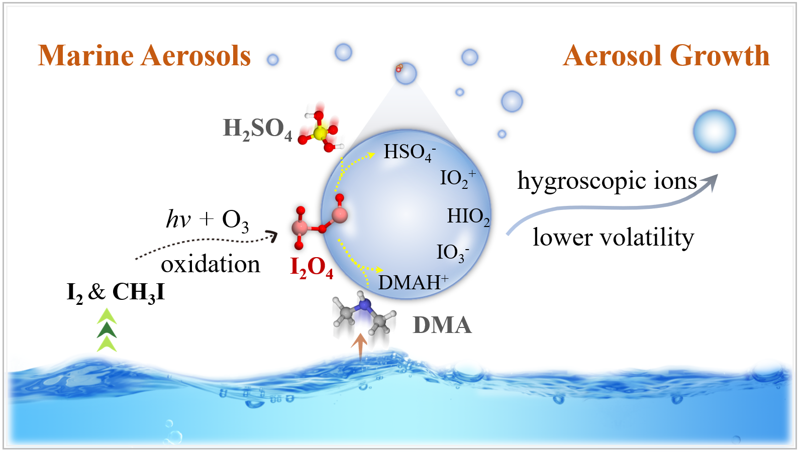 海洋气溶胶构成了全球最大的自然源气溶胶体系,对全球的辐射平衡、气候变化乃至人们的生活都有着重要影响。尽管已有研究表明含碘物质与海洋气溶胶的形成密切相关,但其参与的气溶胶增长机制尚不清楚。已有实验室研究表明,碘氧化物(IxOy)是气溶胶粒子形成的重要组分(其中四氧化二碘I2O4浓度最高)。然而,外场检测到的气溶胶粒子的主要碘组分为IO3-离子,却未检测到碘氧化物。实验室与外场观测上的分歧难以用当前的化学反应机制来解释,这很大程度上限制了人们对碘氧化物如何影响海洋气溶胶形成的理解。