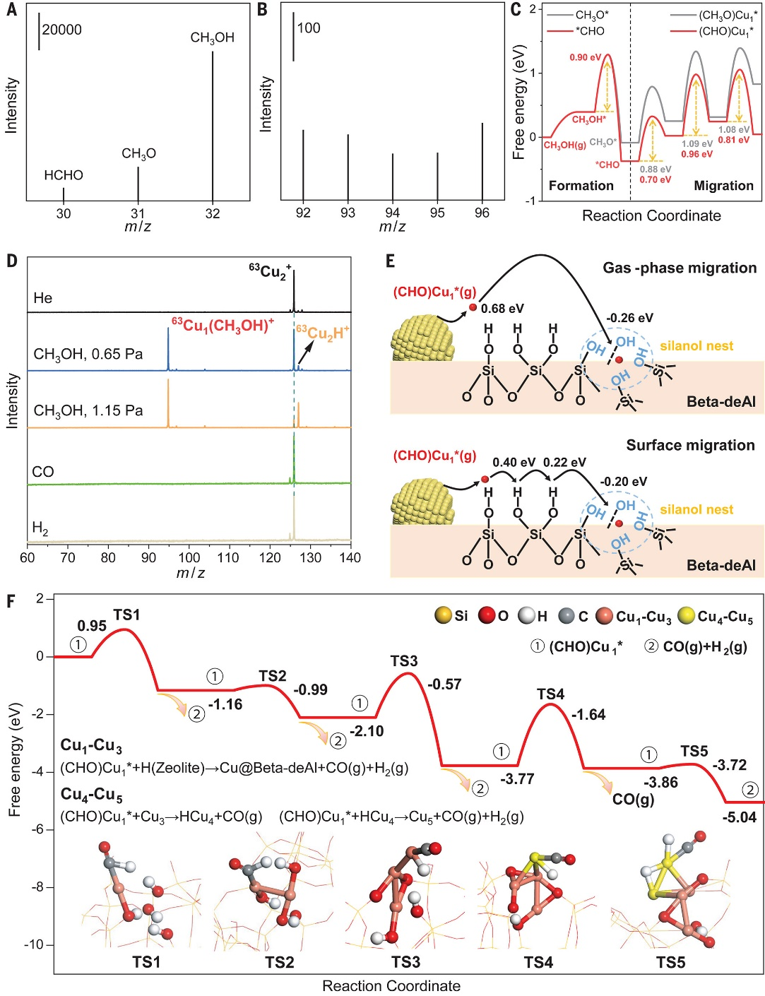 基于铜纳米粒子的催化剂已广泛应用在工业当中,但在化学氛围中纳米粒子往往会烧结成较大的纳米粒子进而降低催化剂的性能。本文通过使用脱铝的Beta分子筛来负载Cu纳米颗粒(Cu/Beta-deAl),发现这些颗粒在200°C的甲醇蒸气中变小,尺寸大小由~5.6 nm减少到~2.4 nm,这与一般的烧结现象大相径庭。另一方面,一种反向的奥斯特瓦尔德成熟的过程被发现,其中甲醇活化的可迁移铜位点被硅醇巢捕获,巢中的铜作为形成小纳米颗粒的新成核位点。这一特性与一般的烧结通道不同,从而在工业上制备了用于草酸二甲酯(DMO)加氢的稳定催化剂。