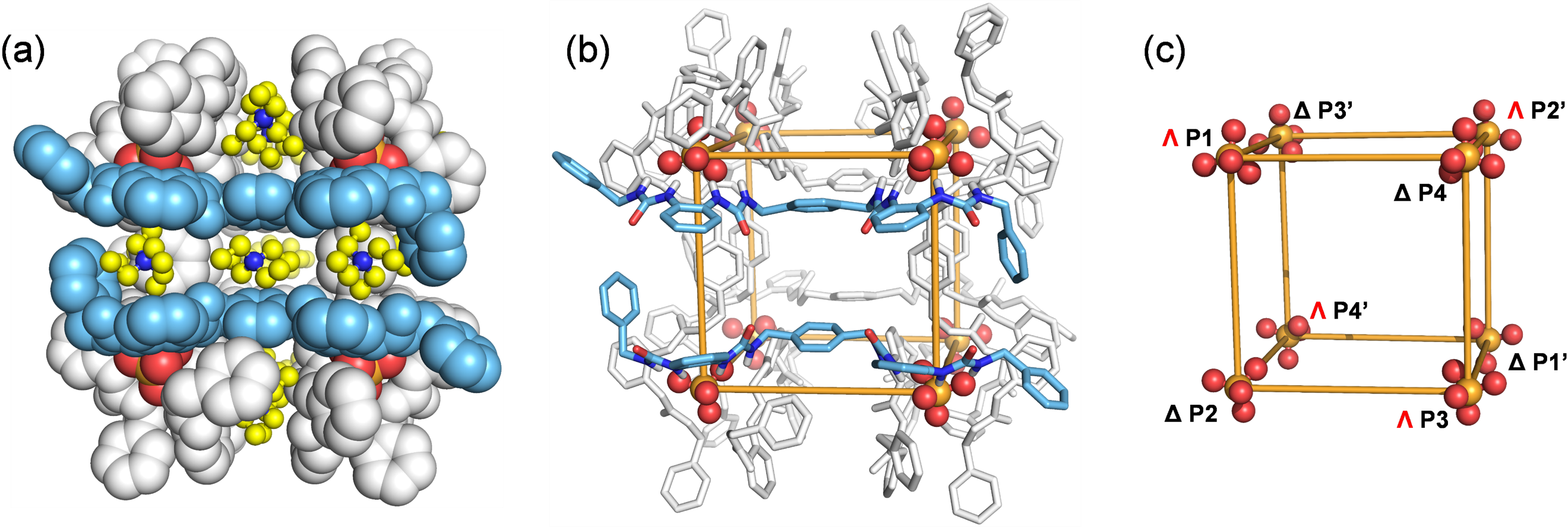 图4. (a)立方体C-L4S-TEA结构中两种配位构像非镜像对称,并且Δ-构象的螺旋性更强;(b)螺旋结构和立方体结构的圆二色信号;(c)模板客体调控的螺旋与立方体结构之间的转变。
