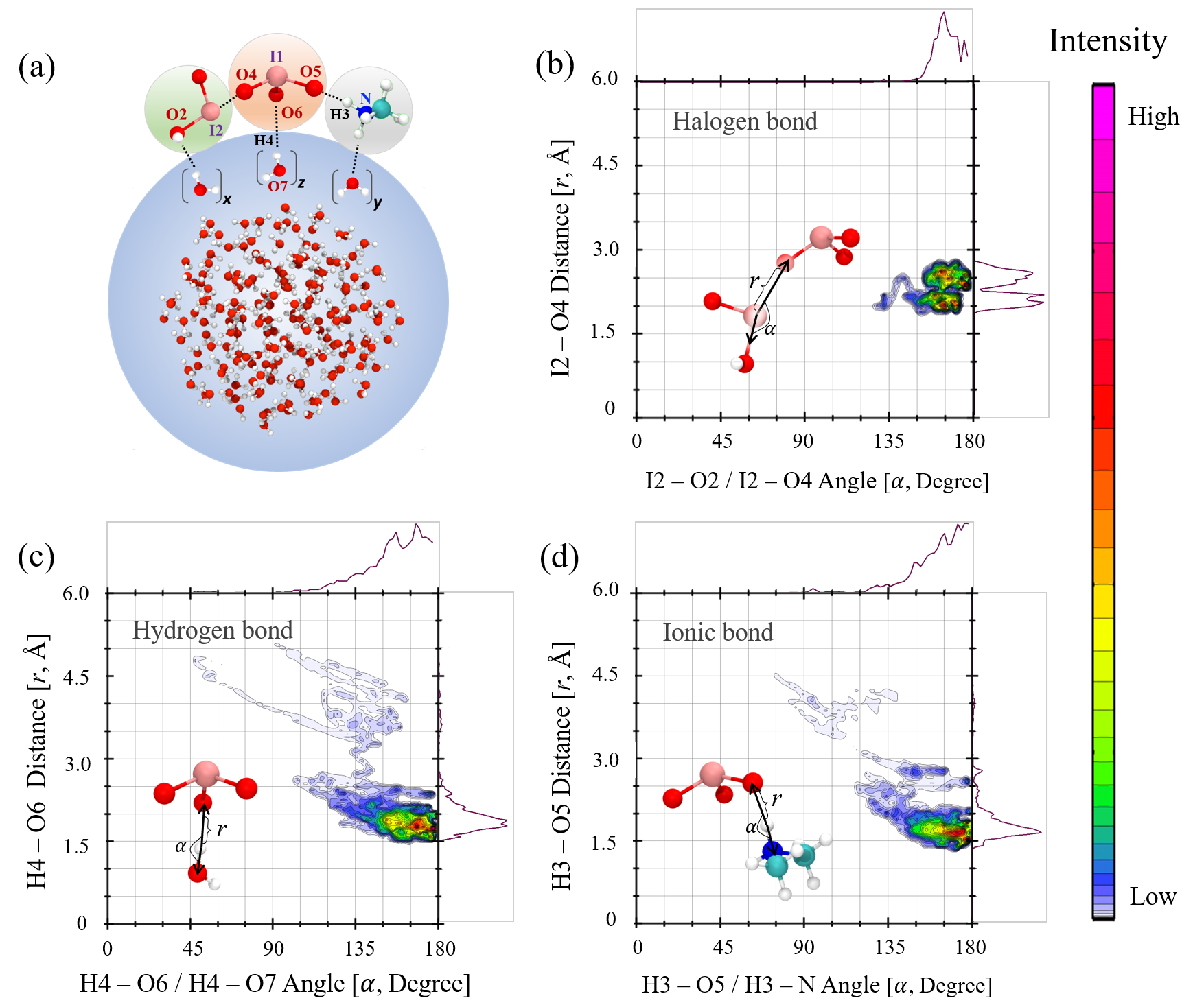 动漫屋 张秀辉教授团队及其合作者通过量子化学计算与第一性原理分子动力学模拟相结合的方案揭示的大气中硫酸和胺类物质影响下的I2O4的气-液界面(即液相气溶胶表面)上的非均相反应机制则较好地解释了上述分歧问题。由于真实大气中的化学组分远比“单纯”的实验环境更为复杂,除碘氧化物外,还存在着污染物硫酸、以及海洋类生物排放生成的胺类组分。她们合作研究发现,在硫酸和有机胺的参与下,I2O4可在气溶胶气-液界面快速(皮秒级别)反应(图1)生成亚碘酸HIO2以及一系列离子产物,如HSO4-、IO3-、DMAH+等。所生成的反应产物间可通过氢键、卤键和离子键结合为尺寸更大的复合物,进而限制其向液滴体相的扩散;同时,界面水分子通过氢键与产物分子结合,使其难以蒸发至气相(图2)。且上述附着于液滴表面的产物(IO3-/DMAH+等)相比于反应物(I2O4/DMA等)有更低的挥发性和更高的吸湿性(图3),还可促进气溶胶的吸湿性增长。
