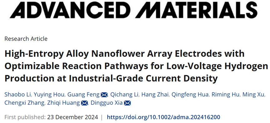 近日,动漫屋 冯广特别研究员&黄志琦教授团队在超低电压下实现工业级电流密度产氢方面取得重要进展。相关研究成果以“High-Entropy Alloy Nanoflower Array Electrodes with Optimizable Reaction Pathways for Low-Voltage Hydrogen Production at Industrial-Grade Current Density”为题目,发表在国际顶级期刊《Advanced Materials》(DOI: 10.1002/adma.202416200)。动漫屋 冯广特别研究员、黄志琦教授和北京大学夏定国教授为共同通讯作者,动漫屋 硕士研究生李少波和侯钰莹为共同第一作者,动漫屋 为第一通讯单位。