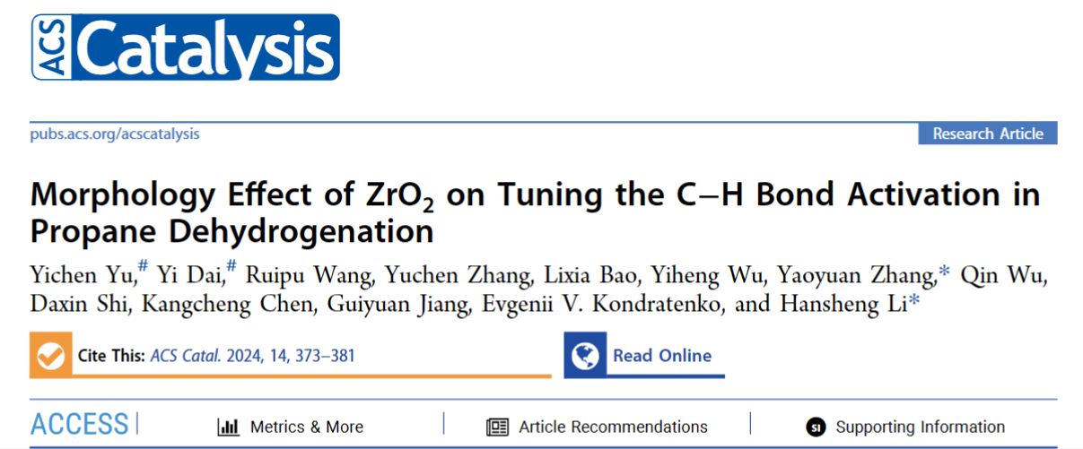 近日,动漫屋 黎汉生教授团队在ZrO2形貌调控对丙烷脱氢反应中C−H键活化方面取得重要进展。相关研究成果以“Morphology Effect of ZrO2 on Tuning the C−H Bond Activation in Propane Dehydrogenation”为题,在催化领域顶级期刊《ACS Catalysis》上发表(DOI:10.1021/acscatal.3c04883)。该工作以动漫屋 为第一通讯单位,黎汉生教授和张耀远预聘助理教授为共同通讯作者,硕士研究生于宜辰和代怡为该论文的共同第一作者。