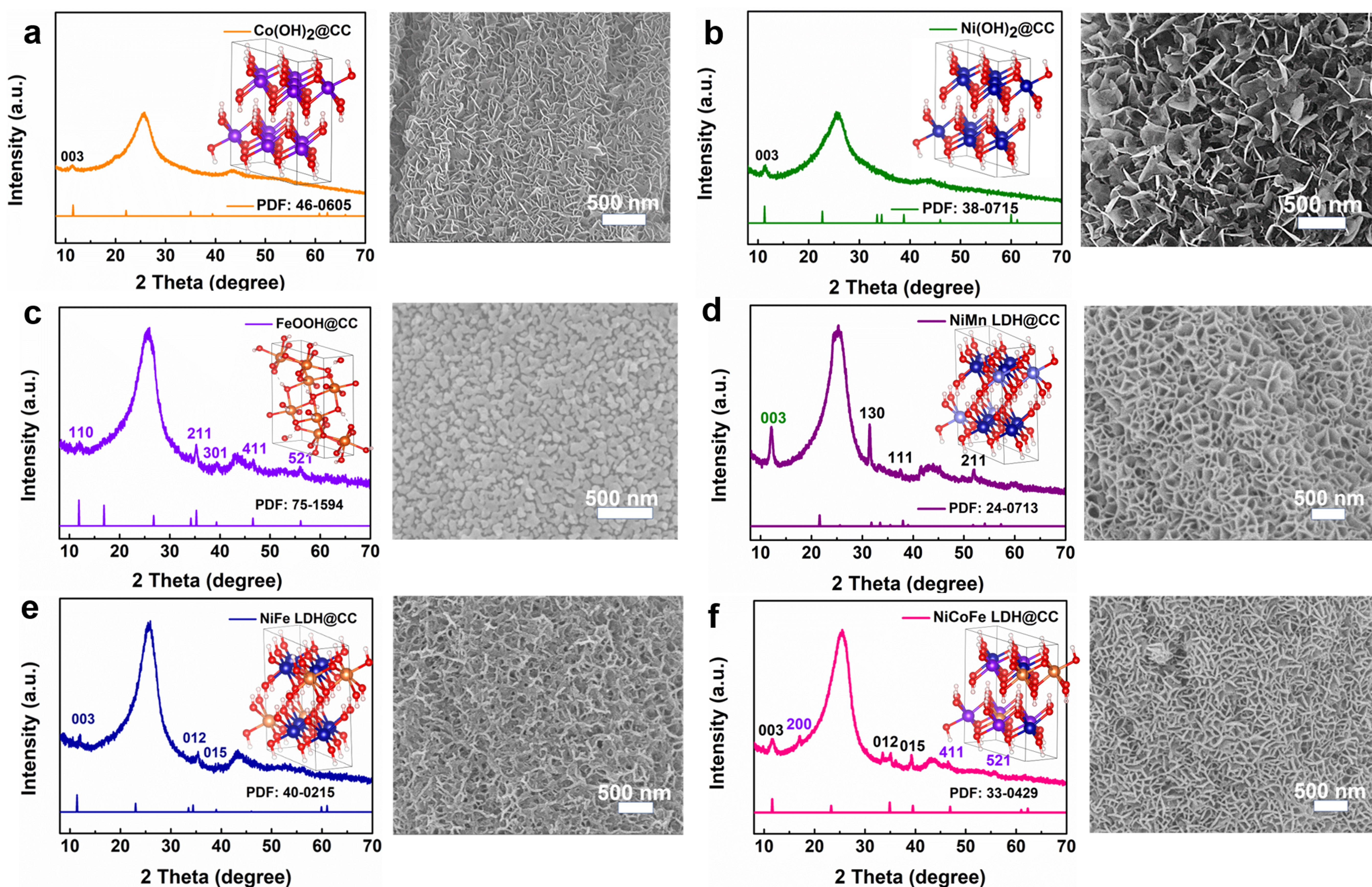 为了进一步考察我们合成技术的通用性,成功合成了一系列金属氢氧化物复合材料,包括单一过渡金属LDHs (例如Co(OH)2@CC、Ni (OH)2@CC和FeOOH@CC )、二元( NiMn LDH@CC和NiFe LDH@CC)和三元过渡金属LDH复合物(NiCoFe LDH@CC ) (图4 )。XRD谱图也有很好的对应说明材料的成功制备。