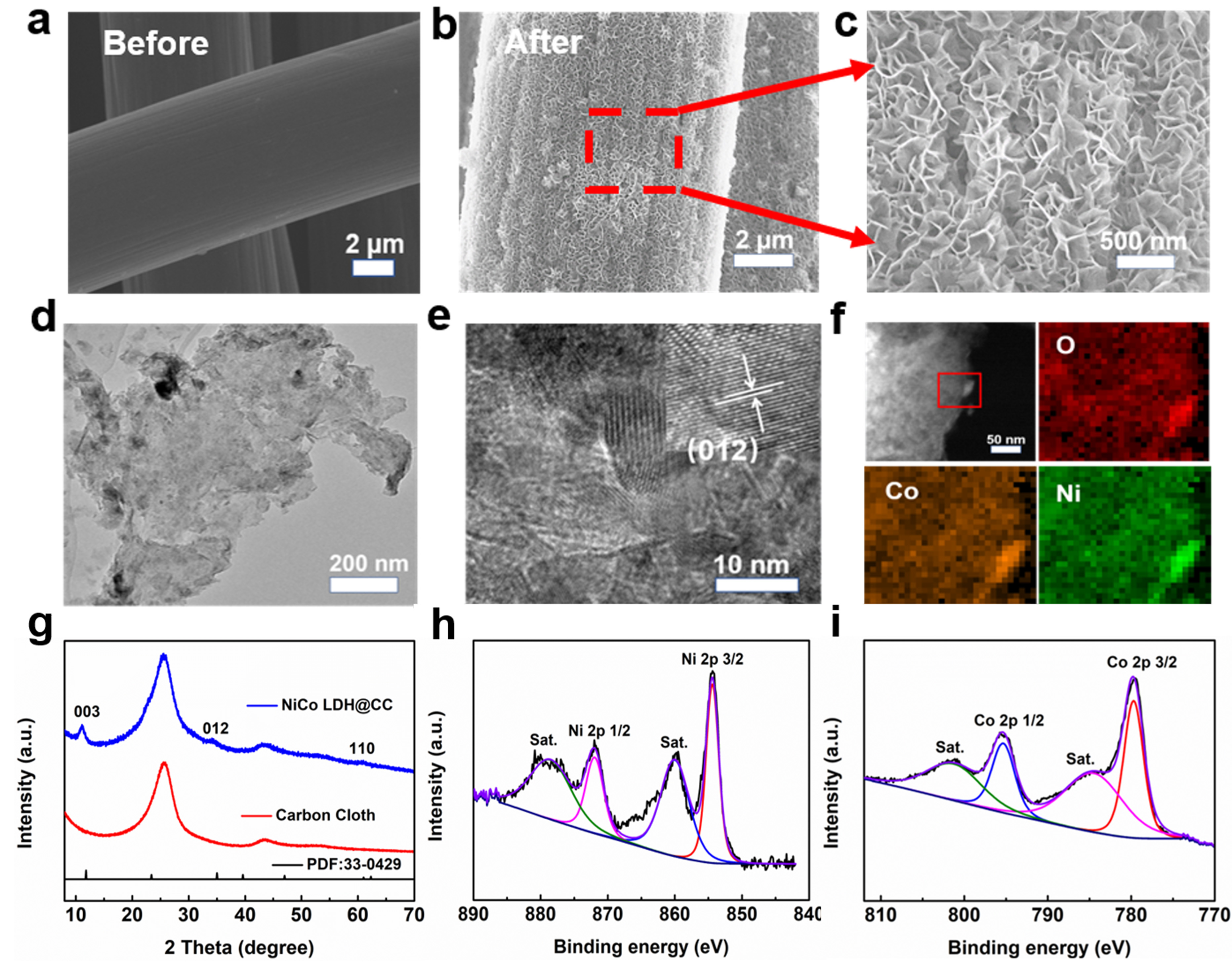 为了研究热冲击前后所得样品的形貌和结构,进行了SEM和TEM表征。经热冲击处理约2秒的碳布显示出粗糙和亲水表面,大大避免了复杂和繁琐的传统预处理过程。随着前体溶液的浓度增加到0.25 mol L-1,目标相变成由纳米片构成的三维互连网络(图2b,c),显示了促进电解质离子传输的潜在可能性。图2d中的透射电子显微镜(TEM)进一步揭示了NiCo LDH的超薄纳米片结构,其中晶格距离为0.256nm,属于NiCo LDH的(012)平面(图2e),表明成功形成了NiCo-LDH。NiCo-LDH的均匀元素图谱表明,纳米片主要由Co和Ni以及O组成。