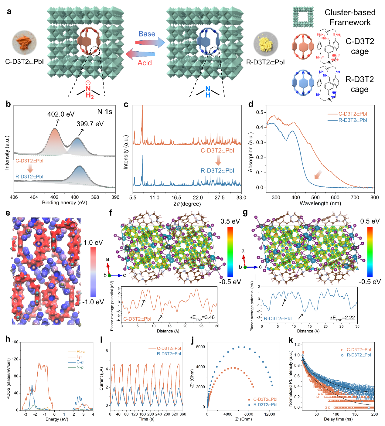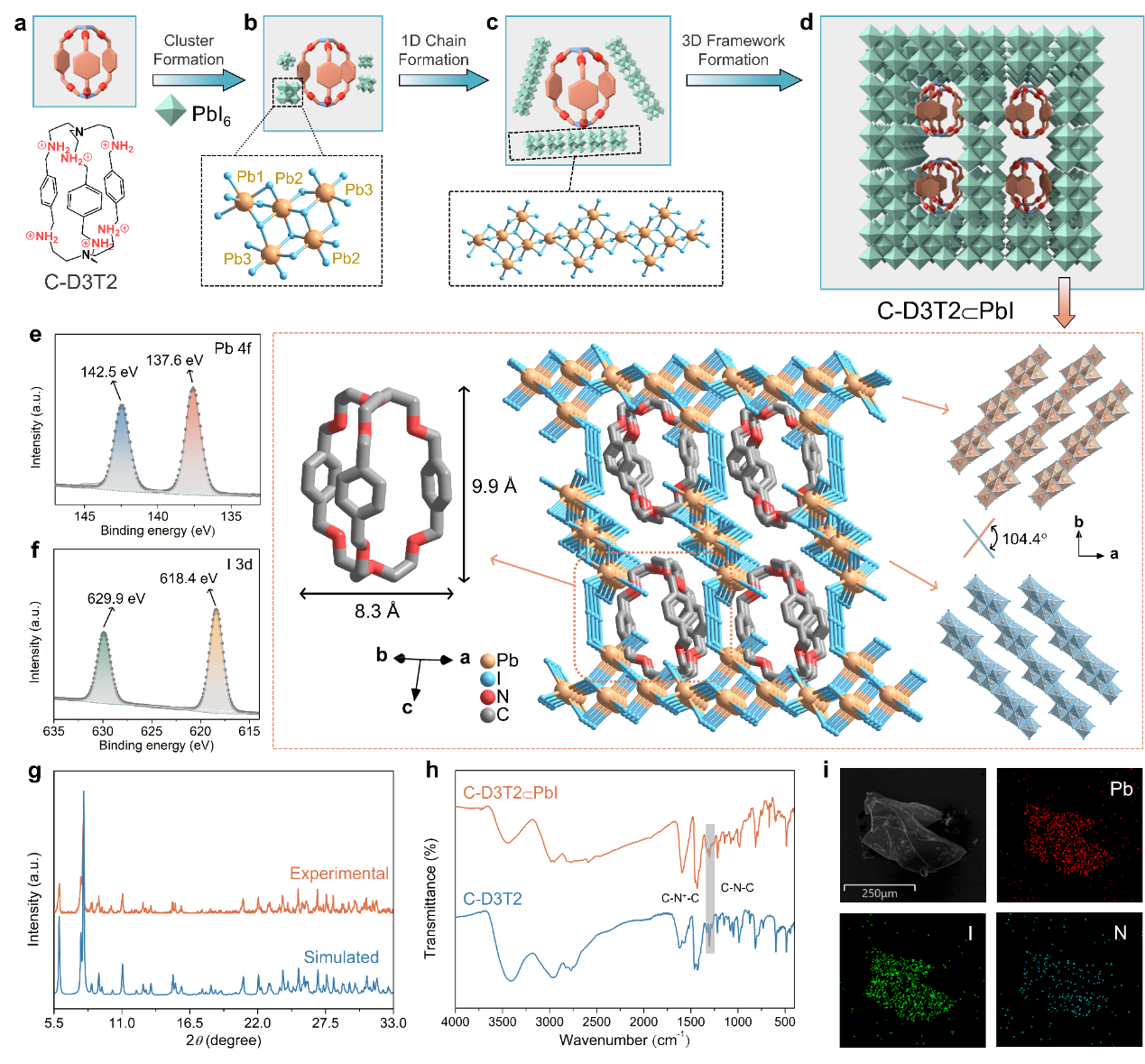 基于此,孙建科教授与杨国昱教授合作,采用荷正电的有机分子笼(C-D3T2)为构筑单元,借助静电作用与化学键耦合的组装策略,将其精准嵌入由铅碘团簇构成的三维框架通道中,成功构建了具有明确单晶结构的“主体⊂主体”嵌套型多级次材料(C-D3T2⊂PbI),在精准多级结构设计与合成领域取得了重要突破。