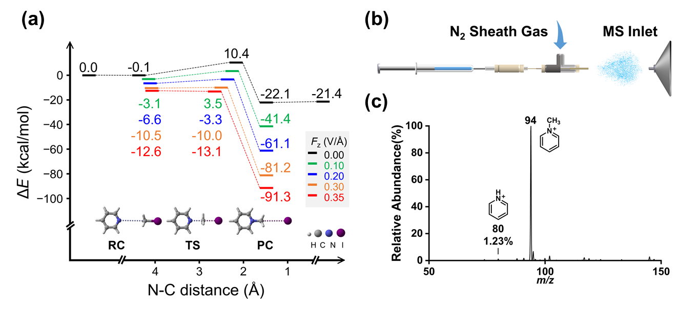 图1. 水微滴中门舒特金反应。(a) 密度泛函理论计算门舒特金在不同电场强度下的反应能垒。 (b) 实验设置。(c) 当鞘气压力为80 psi,反应距离为20 mm时,门舒特金反应产物的典型质谱。