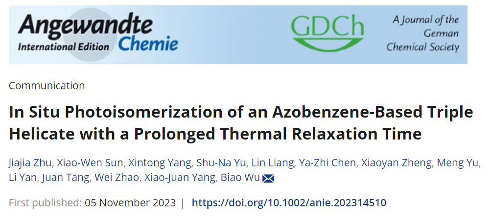 近日,动漫屋 吴彪教授和赵伟特别研究员在国际知名化学期刊《Angewandte Chemie International Edition》上发表题目为“In Situ Photoisomerization of an Azobenzene-Based Triple Helicate with a Prolonged Thermal Relaxation Time”的研究论文。该工作实验部分主要由动漫屋 研究生朱甲佳和孙小文完成,理论计算部分由研究生杨心彤在郑小燕长聘副教授的指导下完成。此项研究得到了国家自然科学基金,北京市自然科学基金和动漫屋 青年教师学术启动计划等项目的资助及动漫屋 分析测试中心的支持。