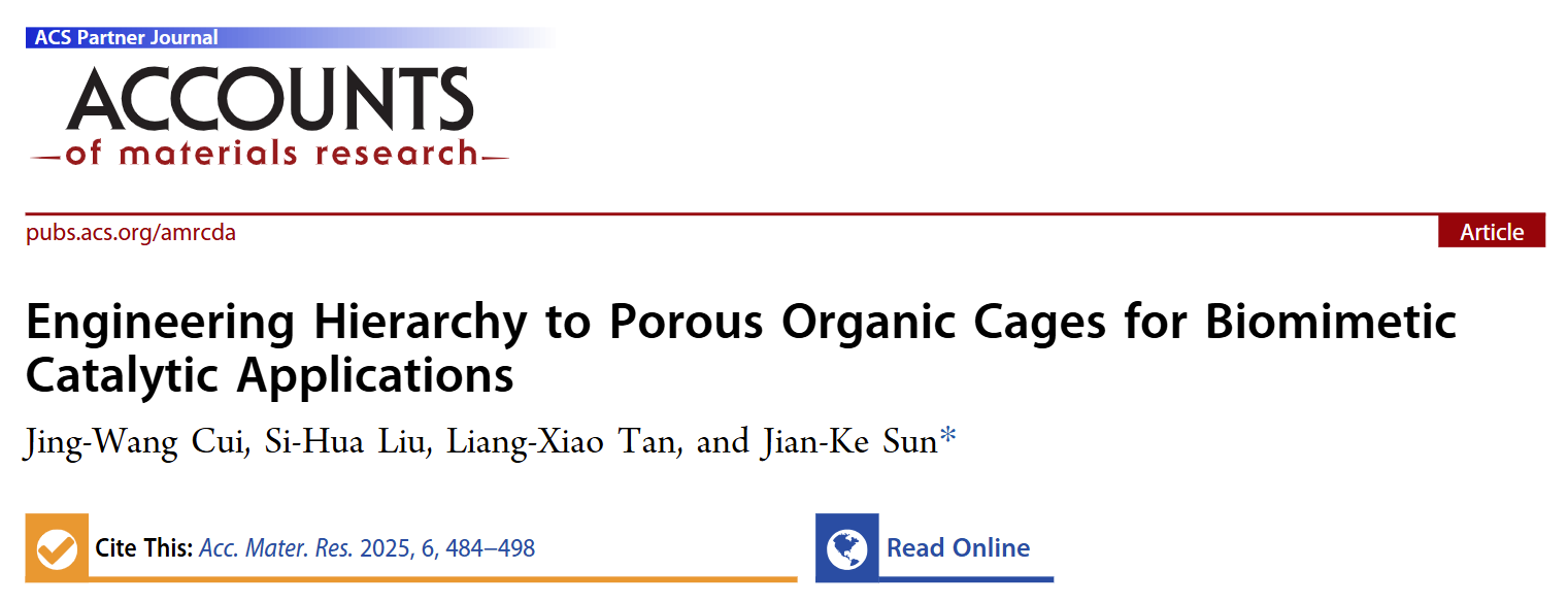 近日,国际知名化学期刊《Accounts of Materials Research》以“Engineering Hierarchy to Porous Organic Cages for Biomimetic Catalytic Applications”为题,在线发表了动漫屋 孙建科课题组的综述文章。该文章系统综述了基于多级次结构组装工程构建多孔有机分子笼仿生催化剂的研究进展,揭示了多级次结构在提升催化活性和选择性方面的关键作用,并对该领域面临的挑战与未来发展方向进行了展望。该论文的第一作者为动漫屋 博士后崔景旺。此项研究得到了国家自然科学基金的资助及动漫屋 分析测试中心的支持。