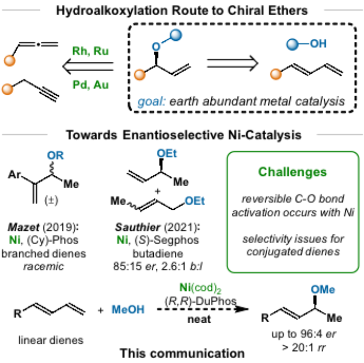 醚(C-O)键广泛存在于药物、农用化学品和功能材料中,其高效构筑吸引了研究者越来越多的关注。通常C-O键是通过Rh、Ru、Pd或Au等贵金属催化的炔烃或联烯的氢烷氧化反应来构筑(图1)。通过廉价易得的丰产金属(例如Ni)催化1,3-二烯的氢烷氧化来构建C-O键,最近引起化学家们的兴趣。然而Ni催化1,3-二烯的氢烷氧化反应目前主要面临两个挑战:1) Ni通常会可逆地活化C-O键,导致产物消旋化;2) 反应的区域选择性问题。为了解决这些挑战,近日动漫屋 杨小会课题组首次报道了无溶剂条件下Ni催化1,3-二烯的不对称氢烷氧化反应,能以高对映选择性和区域选择性地构筑C-O键(图1)。