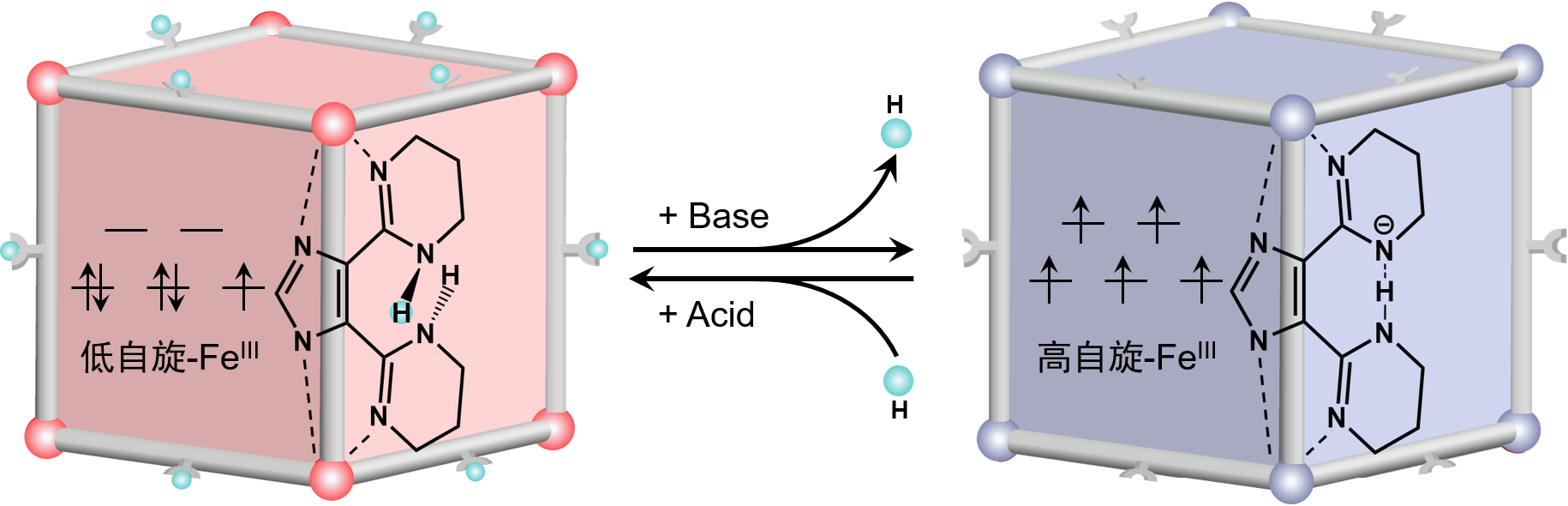 自旋交叉(spin-crossover, SCO)分子是一类能够在高-低自旋态之间可逆转换的磁性响应材料,其自旋转变具有高度的灵敏性,因此可用于设计刺激响应金属有机笼。但是,当前SCO-MOCs的研究集中于FeⅡ体系,其空气敏感性限制其实际应用。另外,现有SCO-MOCs无法提供pH活性位点,难以胜任生物体内复杂酸碱环境的高精度传感任务。因此开发结构稳定、且具有pH磁响应功能的FeIII型SCO MOCs成为该领域的主要挑战之一。