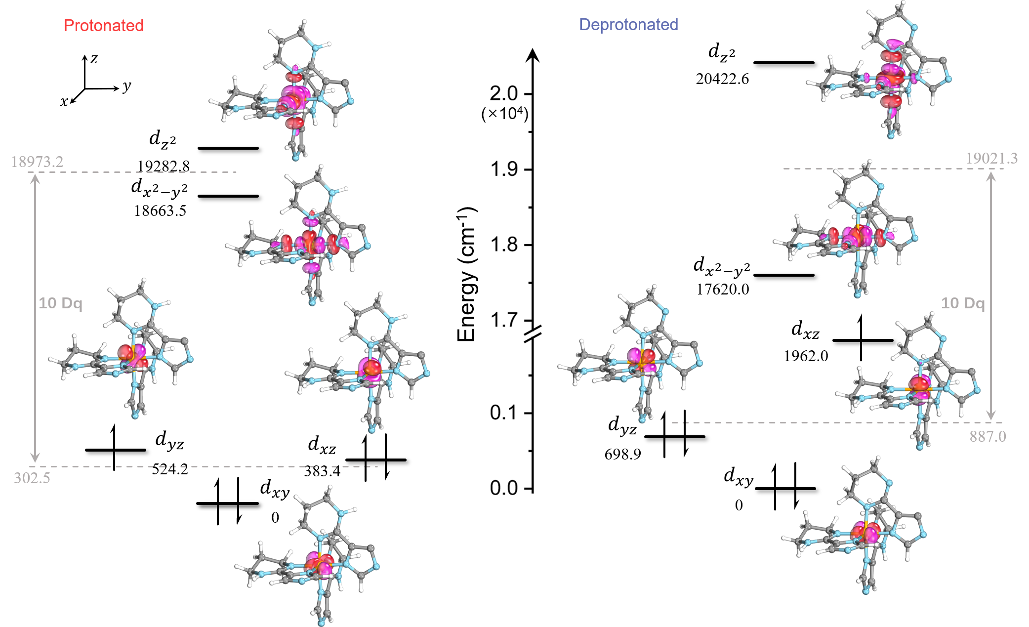 该研究利用有机配体内的双质子互斥效应合成了首例空气稳定且具有明显pH磁响应性质的FeⅢ SCO-MOCs。该八核FeⅢ 在室温以上表现出SCO性质,而通过pH控制活性质子的数目,改变分子内空间位阻,可以实现高-低自旋态的可逆切换。在MOCs中加入碱去质子化过程中,嘧啶上NH质子被移除,分子由低自旋态变为高自旋态,而当再次引入酸后,分子重新恢复为低自旋态,从而实现了质子可逆诱导MOCs的自旋态转变。完全活性空间自洽场(CASSCF)第一性原理计算表明MOCs在去质子化前后配体场的微妙变化诱发了MOCs自旋态的转换。该方法为磁共振成像技术的优化与靶向药物递送系统的精准设计开辟了新的道路。