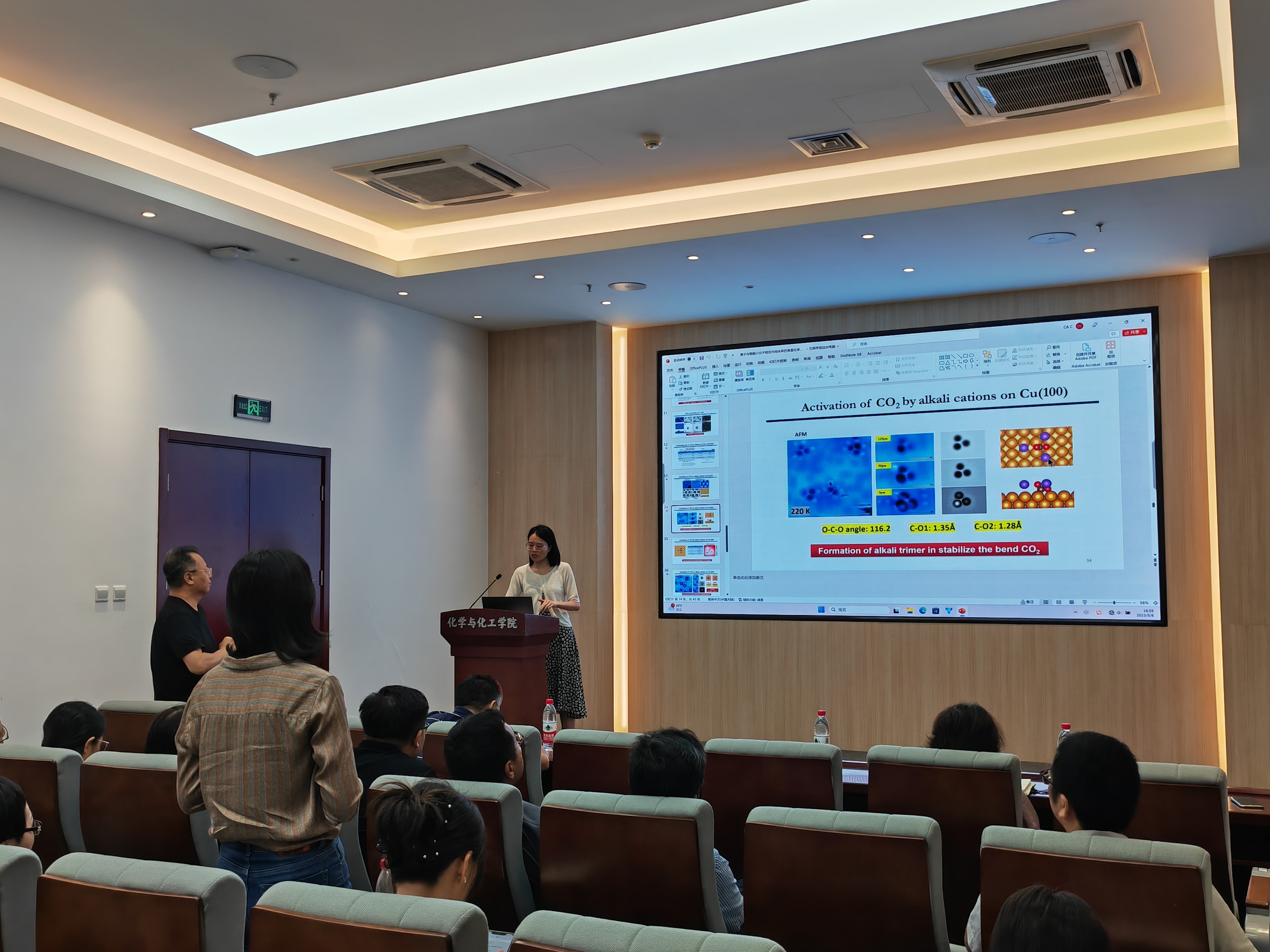 郭静教授首先介绍了水分子、二氧化碳等载能小分子的活化和转化一直受到广泛的关注,对于实现碳中和的目标、助力国家清洁能源的发展有着重要的意义。离子可以直接参与并影响载能小分子的活化和转化过程,但是对于其微观机理及原子尺度的表征仍然非常有限。紧接着郭静教授介绍了课题组针对氢原子核灵敏的高分辨扫描探针技术,及其在离子与载能小分子相互作用体系的原子层次研究。重点介绍了基于高分辨扫描探针技术开展的三个研究体系:(1)氢离子在金属表面水层中的微观构型以及质子转移过程;(2)表界面水分子如何促进甲酸分子的分解以;(3)碱金属离子如何诱导铜表面二氧化碳分子的活化和转化。