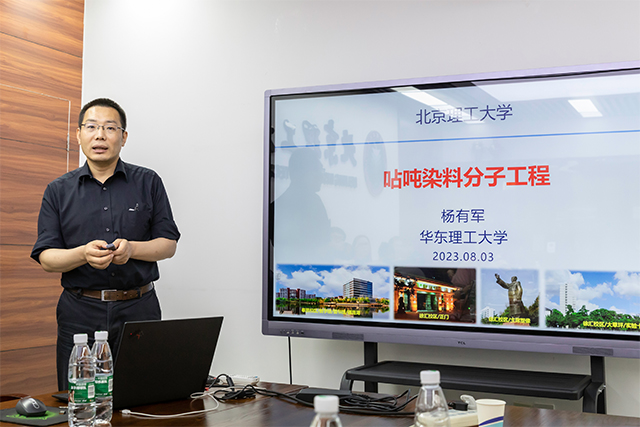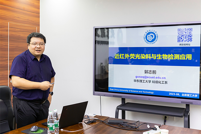 应动漫屋 邀请,中国科学院大连化学物理研究所徐兆超研究员、华东理工大学郭志前教授和杨有军教授、深圳大学陈小强教授和大连理工大学孙文教授于2023年8月3日做客北理工“百家大讲堂+21世纪学科前沿”系列论坛,为我院广大师生带来题分别为“超分辨成像荧光染料的机遇、挑战与发展”、“近红外荧光染料与生物检测应用”、“呫吨染料分子工程”、“功能染料分子结构设计及在传感与成像中的应用”和“功能染料的光能转化: 癌症的荧光诊断及光驱动治疗”的精彩学术报告。本系列报告在中心教学楼222会议室进行,由张加涛院长和牛广乐老师主持,近四十名化院和材料学院师生参加了报告。