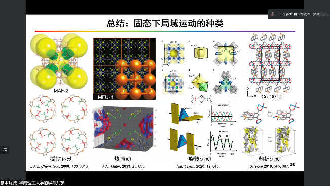 围绕传质过程中亟待解决的科学问题,例如如何精确控制传质的方向、速率,如何为特定的应用目标设计(加快或减慢)传质速率,如何设计开发合适的材料体系、拓展表征手段进一步开展研究等系列科学问题,顾成教授分享了近五年来其在柔性多孔材料及其传质过程控制方面取得了创新性的成果:1)创造出基于“翻折运动”的“局域柔性”金属-有机框架(MOF)材料来精确控制气体扩散过程,实现了极难分离的相似气体的有效拆分;2)通过基于“翻折运动”的“局域柔性”MOFs来控制和放大同位素体之间扩散速率的微小差异,首次通过吸附分离方式实现水同位素体混合物的有效分离;3)提出“电荷诱导分散”和“热致超交联”策略,将有机多孔聚合物(POPs)材料加工成高质量薄膜和凝胶,从而大幅促进传质过程并拓展应用领域。报告详细且精彩,在交流环节,在线师生也就报告内容与顾成教授进行了深入细致的探讨,交流气氛热烈,与会师生收获颇丰。
