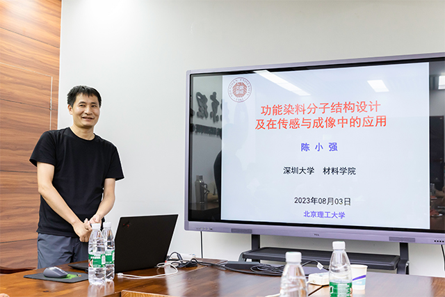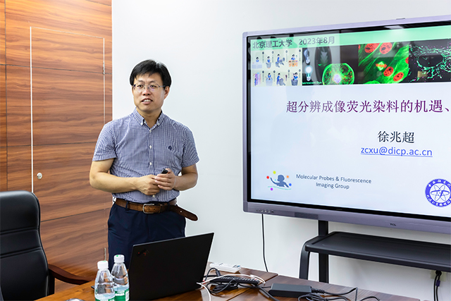 应动漫屋 邀请,中国科学院大连化学物理研究所徐兆超研究员、华东理工大学郭志前教授和杨有军教授、深圳大学陈小强教授和大连理工大学孙文教授于2023年8月3日做客北理工“百家大讲堂+21世纪学科前沿”系列论坛,为我院广大师生带来题分别为“超分辨成像荧光染料的机遇、挑战与发展”、“近红外荧光染料与生物检测应用”、“呫吨染料分子工程”、“功能染料分子结构设计及在传感与成像中的应用”和“功能染料的光能转化: 癌症的荧光诊断及光驱动治疗”的精彩学术报告。本系列报告在中心教学楼222会议室进行,由张加涛院长和牛广乐老师主持,近四十名化院和材料学院师生参加了报告。