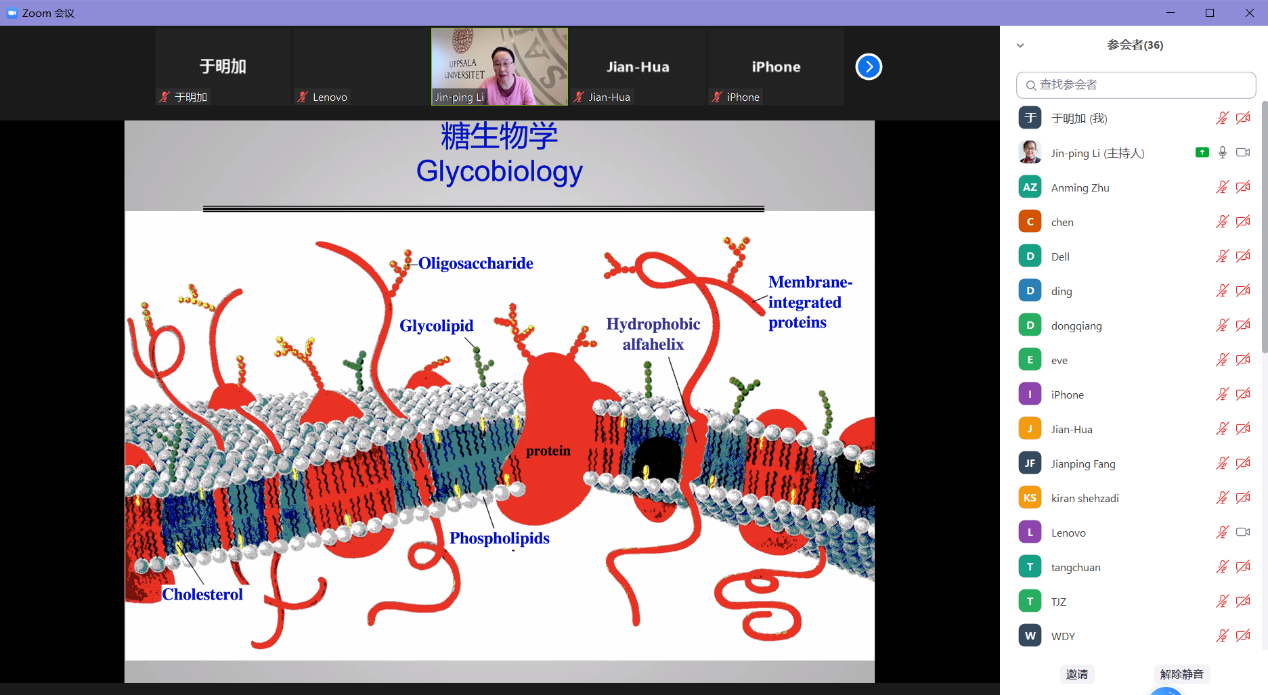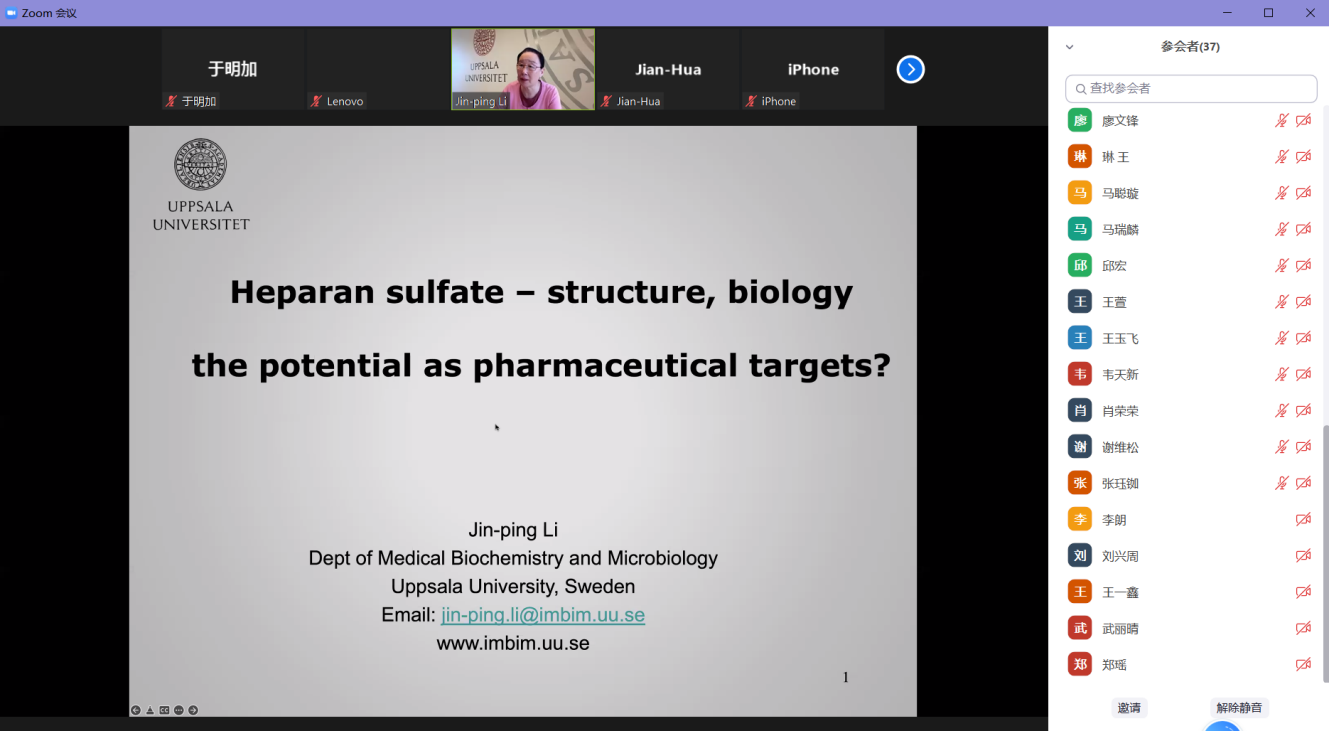 2022年4月25日下午2:30,应动漫屋 梁建华教授邀请,乌普萨拉大学医学院李晋萍教授做客动漫屋 “21世纪学科前沿”系列讲座,为我院广大师生带来题为“Heparan sulfate- structure, biology the potential as pharmaceutical targets”的精彩学术报告。本次报告以Zoom会议线上的方式进行,由于明加特别副研究员主持,学院师生共40余人参加。