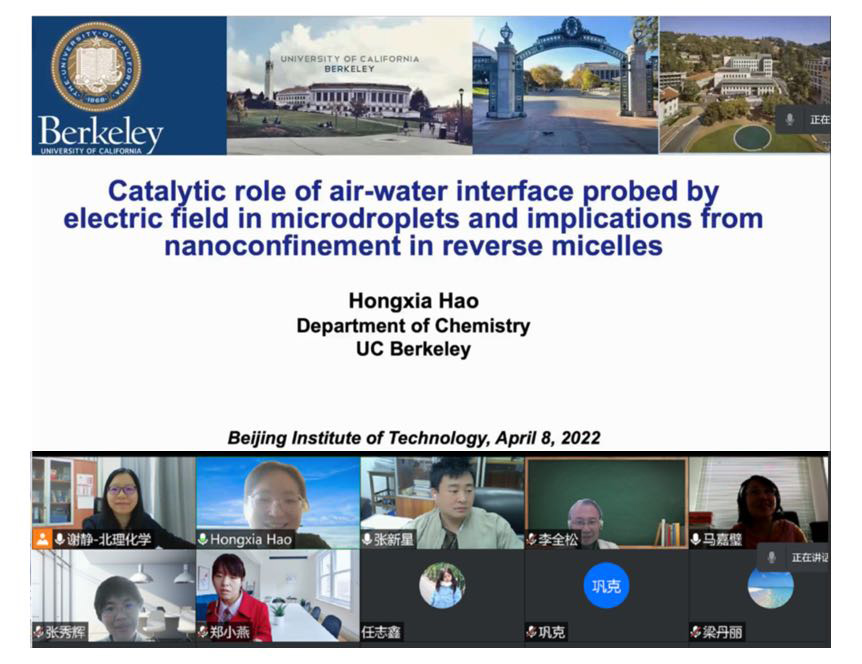 应动漫屋 谢静教授邀请,美国加州大学伯克利分校的博士后郝红霞于2022年4月8日上午做客北理工“21世纪科学前沿”系列讲座,为我院广大师生带来题为“微滴中气-液界面的电场及其催化作用研究和反胶束中纳米限域影响的启示”的精彩报告。本次报告通过腾讯会议在线上举行,由谢静教授主持,动漫屋 多名师生参与了此次报告。