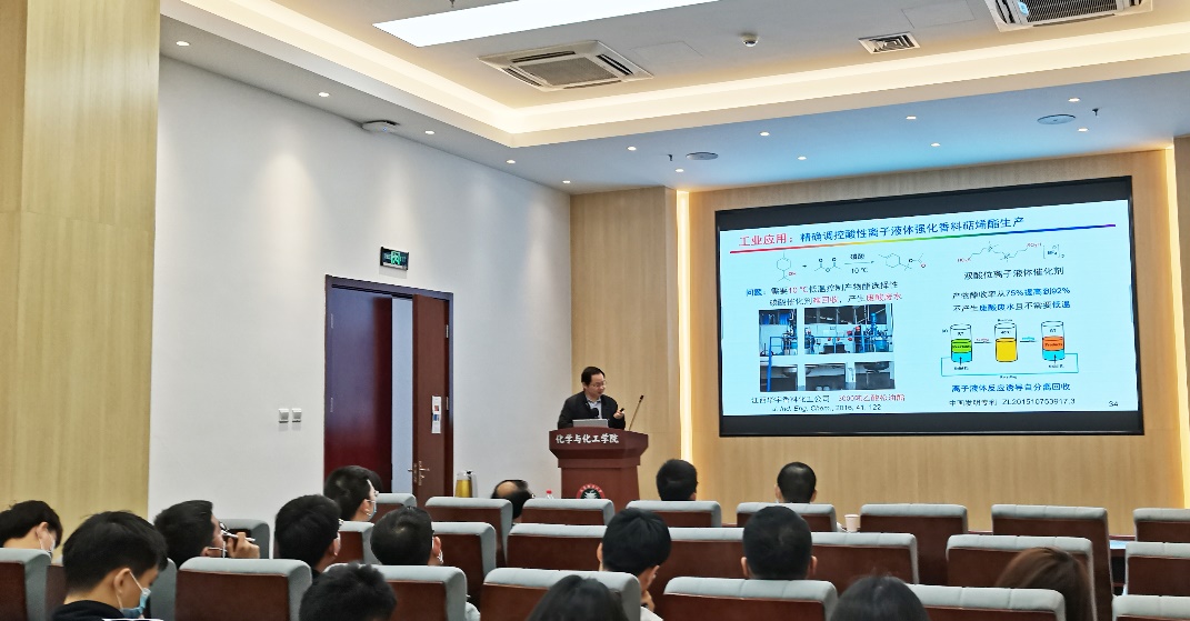学术报告中,陶端健教授深入介绍了其研究团队以调控离子液体微环境,强化传质分离过程为策略,在面向国家重大需求-化工分离节能减排方面的研究进展。在基础研究方面,陶教授重点从提升体系的溶解性、选择性、扩散传质、吸附容量等角度出发,通过精准调控离子液体酸碱度、粘度和氢键等微环境,实现了对难分离体系的高容量、高选择性和快速的吸收分离。具体内容包括通过调控质子位点合成了一系列质子型离子液体并确定了离子液体结构与粘度、酸碱度之间的半定量关系 (Green Energy Environ., 2019, 4, 49; Ind. Eng. Chem. Res., 2018, 57, 6654)。通过制备低粘度质子型离子液体,强化了CO/N2和SO2/CO2难分离物系选择性吸收和分离(Angew. Chem. Int. Ed., 2016, 55, 7166; Angew. Chem. Int. Ed., 2017, 56, 6843; Chem. Eng. J., 2020, 394, 124859)。在工业应用方面,陶教授介绍了复合质子型离子液体强化提高乙酸乙酯传递通量,设计制备了流程简单、分离能耗低、设备腐蚀小的反应萃取精馏强化分离乙酸乙酯新工艺。此外,陶教授还介绍了精确调控酸性离子液体强化香料萜烯酯的生产工艺。在报告会交流环节中,参会师生就报告内容与陶教授进行了深入且细致的探讨,现场交流和讨论气氛热烈,与会师生收获颇丰。