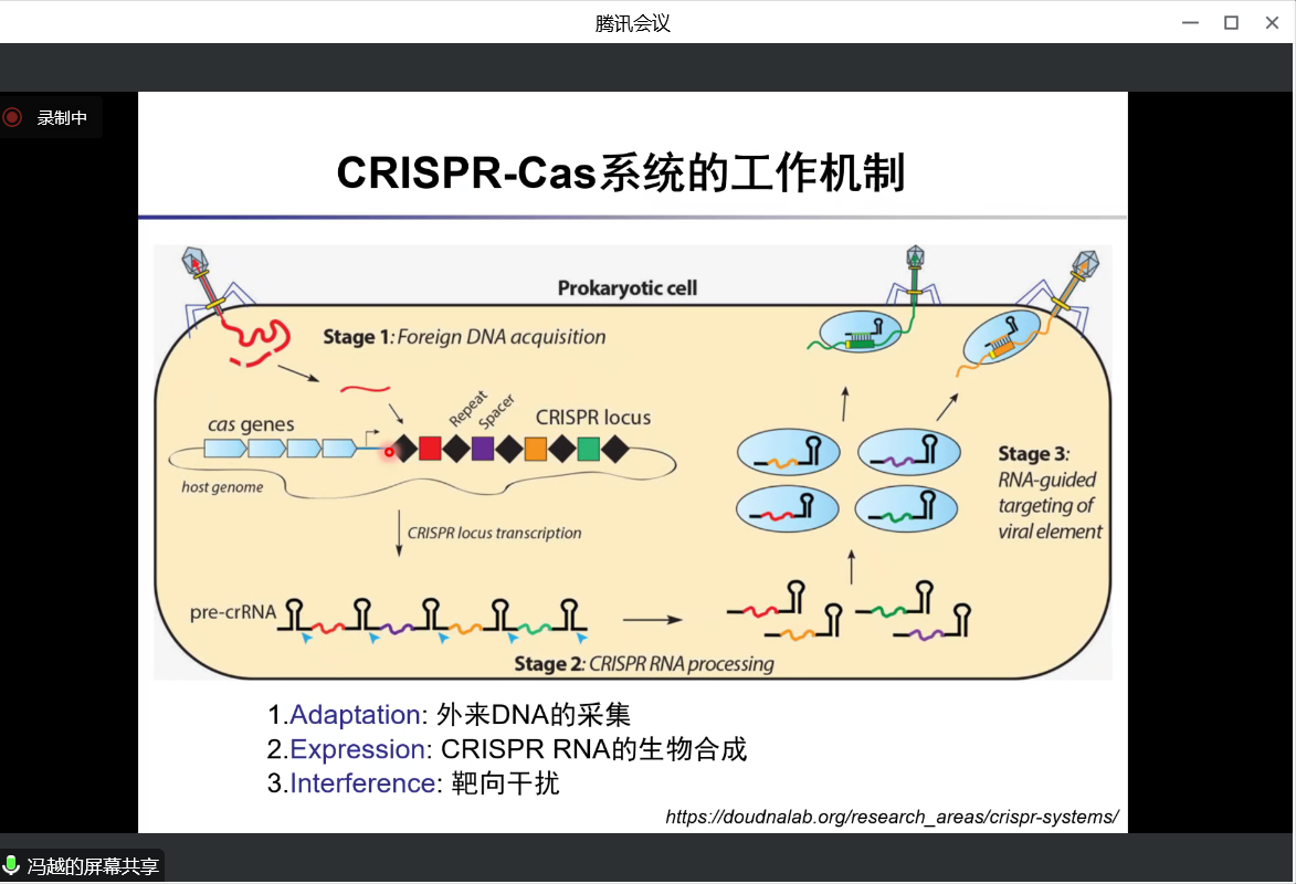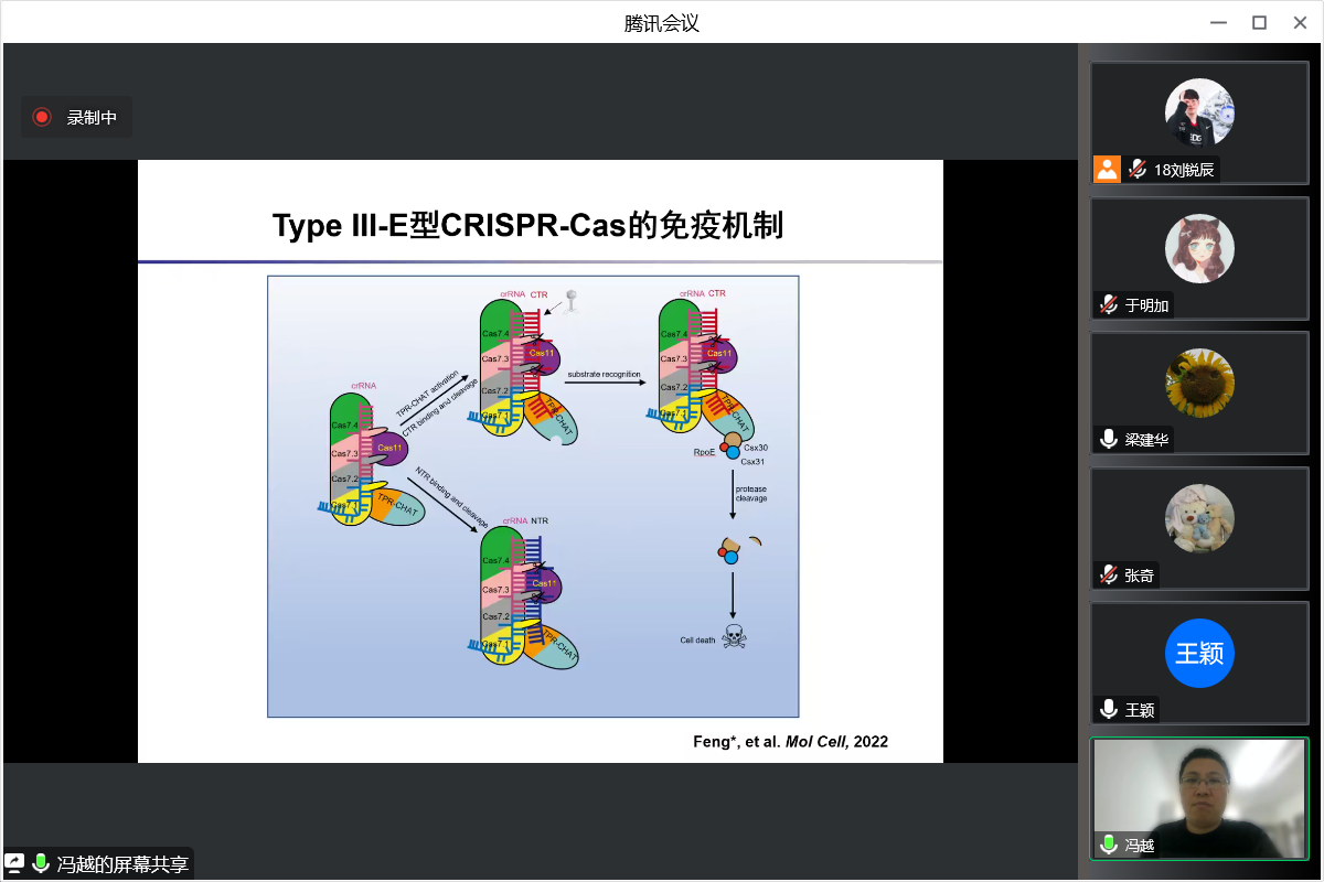 2022年12月24日上午10:00,应动漫屋 梁建华教授邀请,北京化工大学冯越教授做客动漫屋 “21世纪学科前沿”系列讲座,为我院广大师生带来题为“细菌CRISPR-Cas系统及噬菌体Anti-CRISPR蛋白的作用机制研究”的精彩学术报告。本次报告以腾讯会议线上的方式进行,由于明加特别副研究员主持,学院师生共40余人参加。