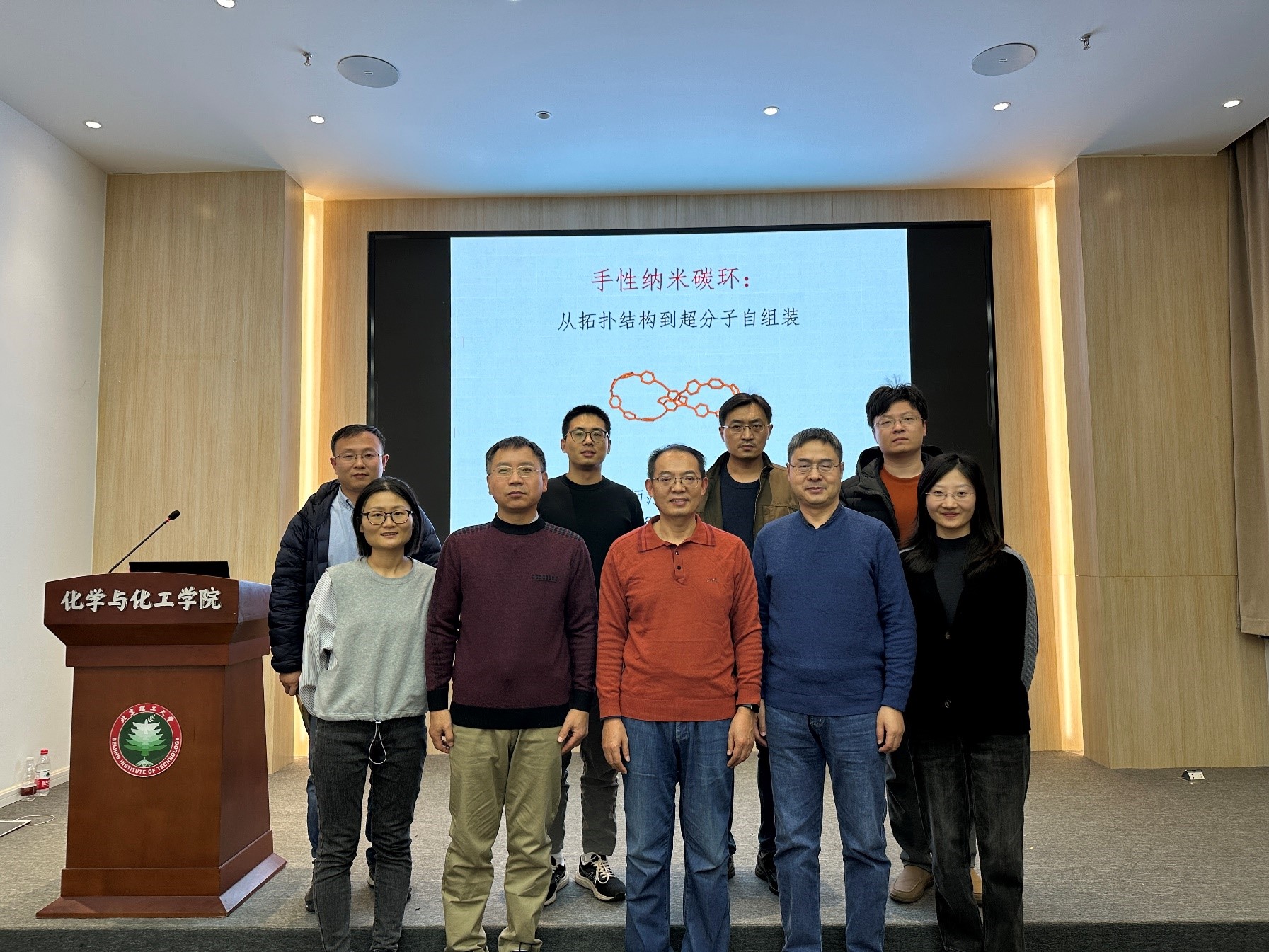 环对苯撑是一类由若干个苯环通过1,4-对位连接而组成的一类有机共轭分子,由于其环状的共轭结构,径向的π-电子体系以及尺寸依赖的物理化学性质和主客体化学性质而受到广泛关注。基于此,江老师首先介绍了通过对环对苯撑结构基元的功能化设计,得到了一系列拓扑结构的大环分子,研究了其光物理性质,发现其荧光强度与苯环数量呈正相关的关系,并对其手性传递、手性稳定性及圆偏振发光的性质进行了探究;其次介绍了大环中功能化基元的区域选择性对拓扑结构的影响以及其拓扑转变;接着又讲述了手性碳纳米环应用于手性三元络合物的分级自组装及其自恋性手性识别;最后又介绍了通过主客体化学将不同发射波长的荧光染料引入到手性大环中,构建了Förster共振能量转移体,实现了可见光区域可调的荧光发光体。