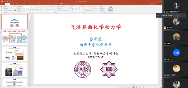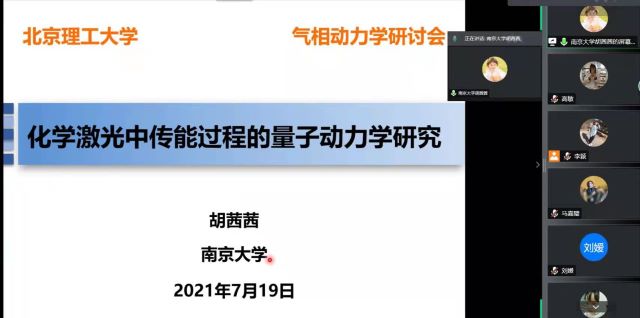 应动漫屋 马嘉璧副教授邀请,中科院大连化物所袁开军研究员、南开大学张新星研究员、南京大学胡茜茜副教授、重庆大学勾茜教授于2021年7月19日上午8:30在腾讯会议线上分别作了题为“基于大连光源的水分子光化学研究” 、“气液界面化学动力学” 、“化学激光中传能过程的量子动力学研究” 、 “Rethinking π Interactions: Rotational stories”的精彩学术报告。报告由马嘉璧副教授主持,谢静教授及几十名同学参加了此次报告会。